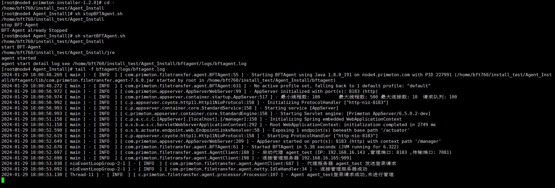 agent start detail log see /home/bft760/install_test/Agent_Install/bftagent/logs/bftagent.log