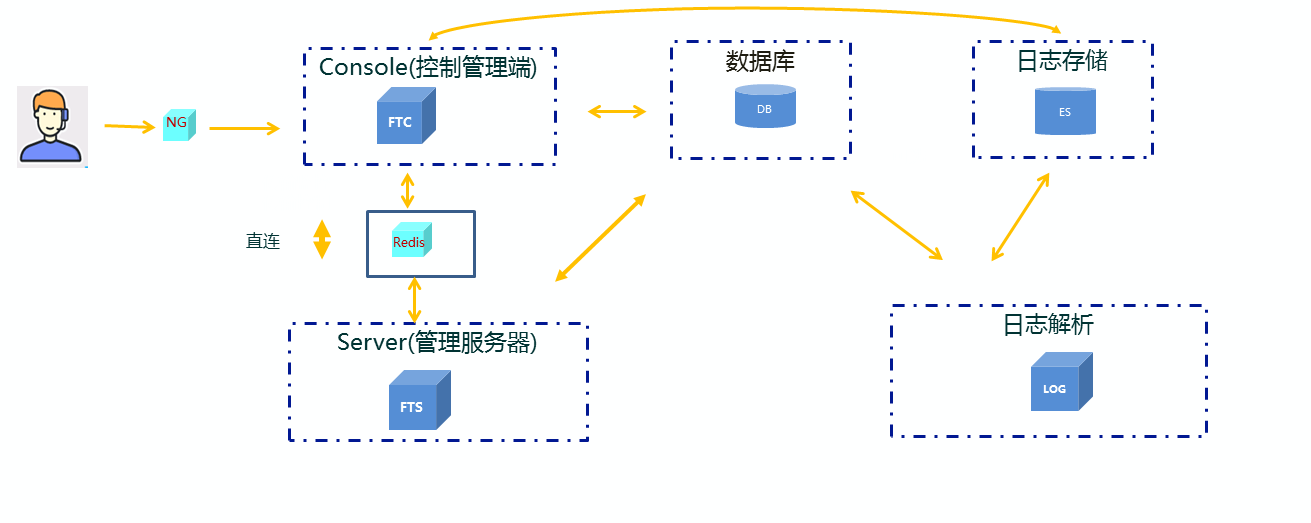 部署控制管理端Console, 管理服务器Server ,日志解析Logcenter,除产品功能模块外,引入Redis以及ES