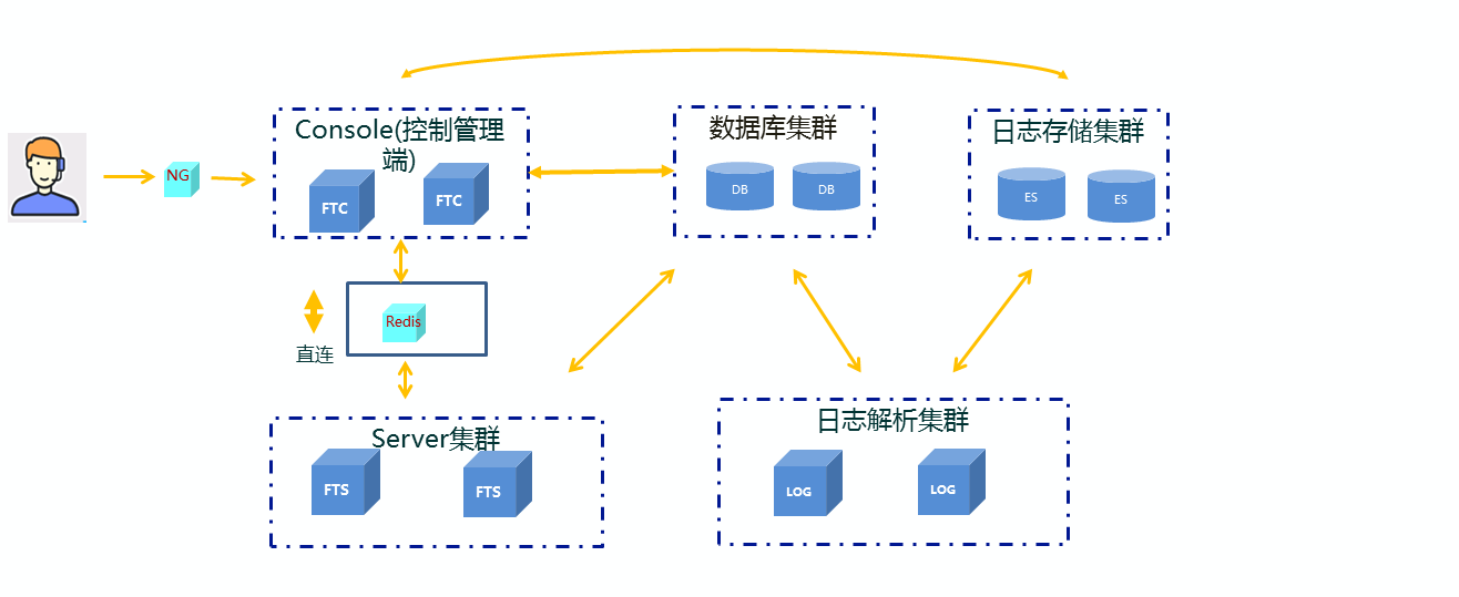 部署多台控制管理端Console, 管理服务器Server ,日志解析Logcenter, 除产品功能模块外,引入Redis以及ES