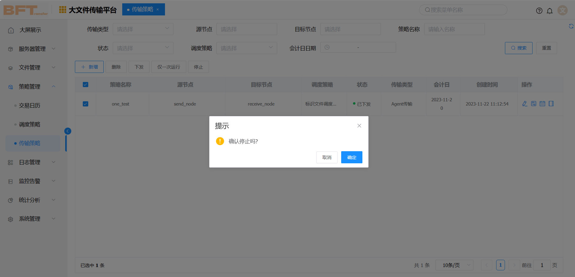 选择需要停止的传输策略,点击【停止】按钮进行策略停止