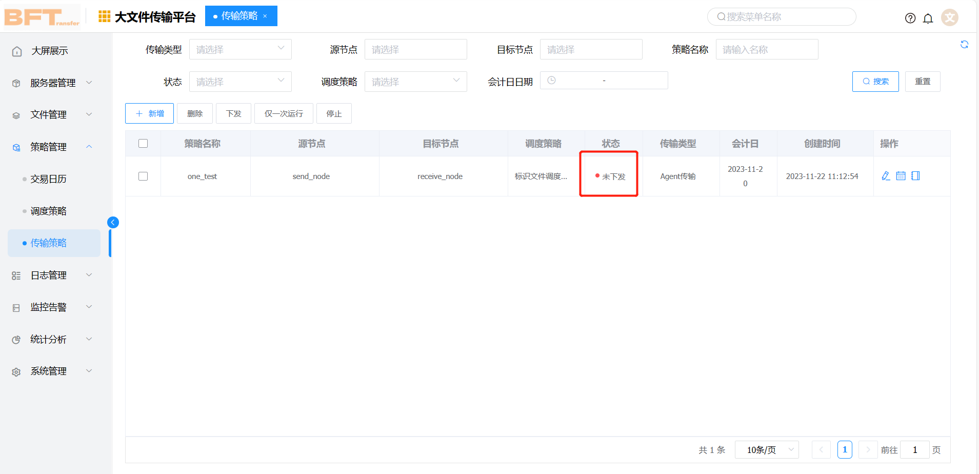 在BFT Console中点击菜单【策略管理】>【传输策略】,右侧区域显示 "传输策略" 界面。