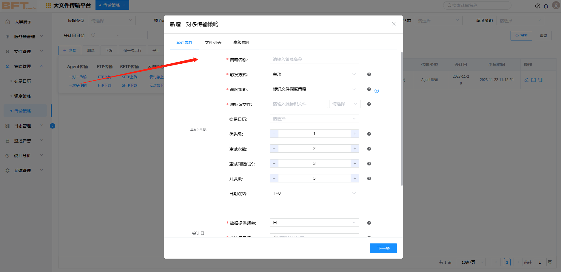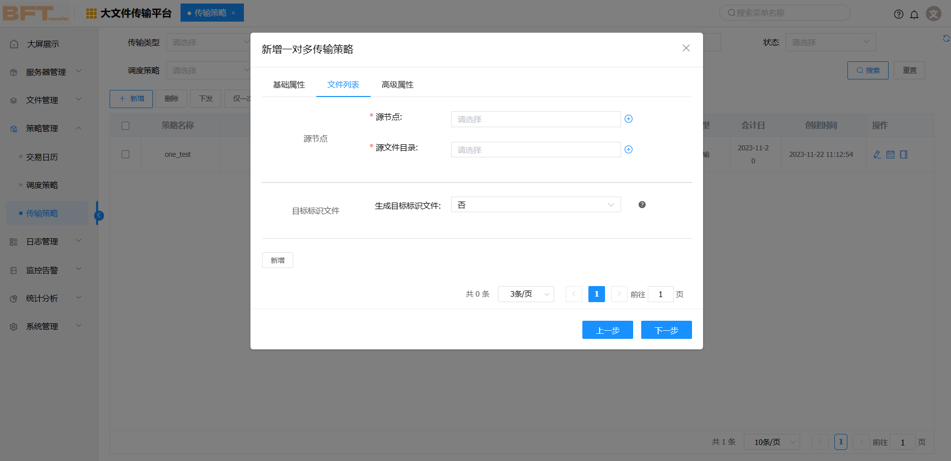 在BFT Console中点击菜单【策略管理】>【传输策略】,右侧区域显示 "传输策略" 界面。