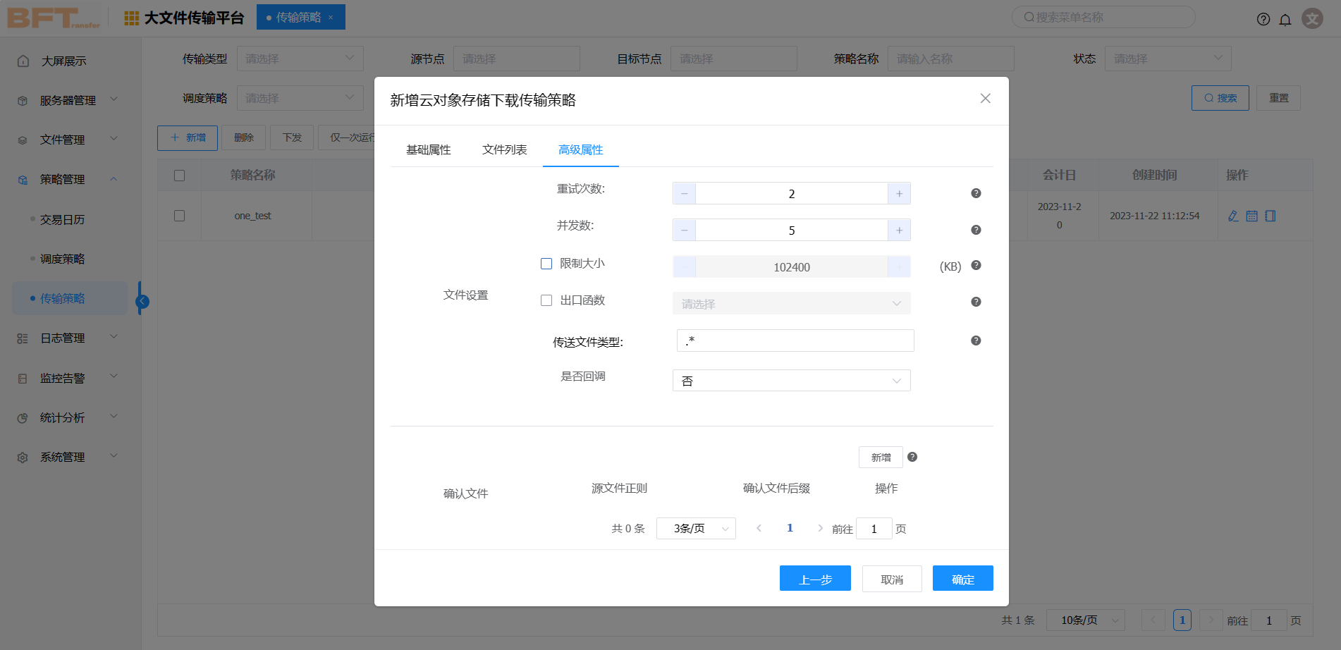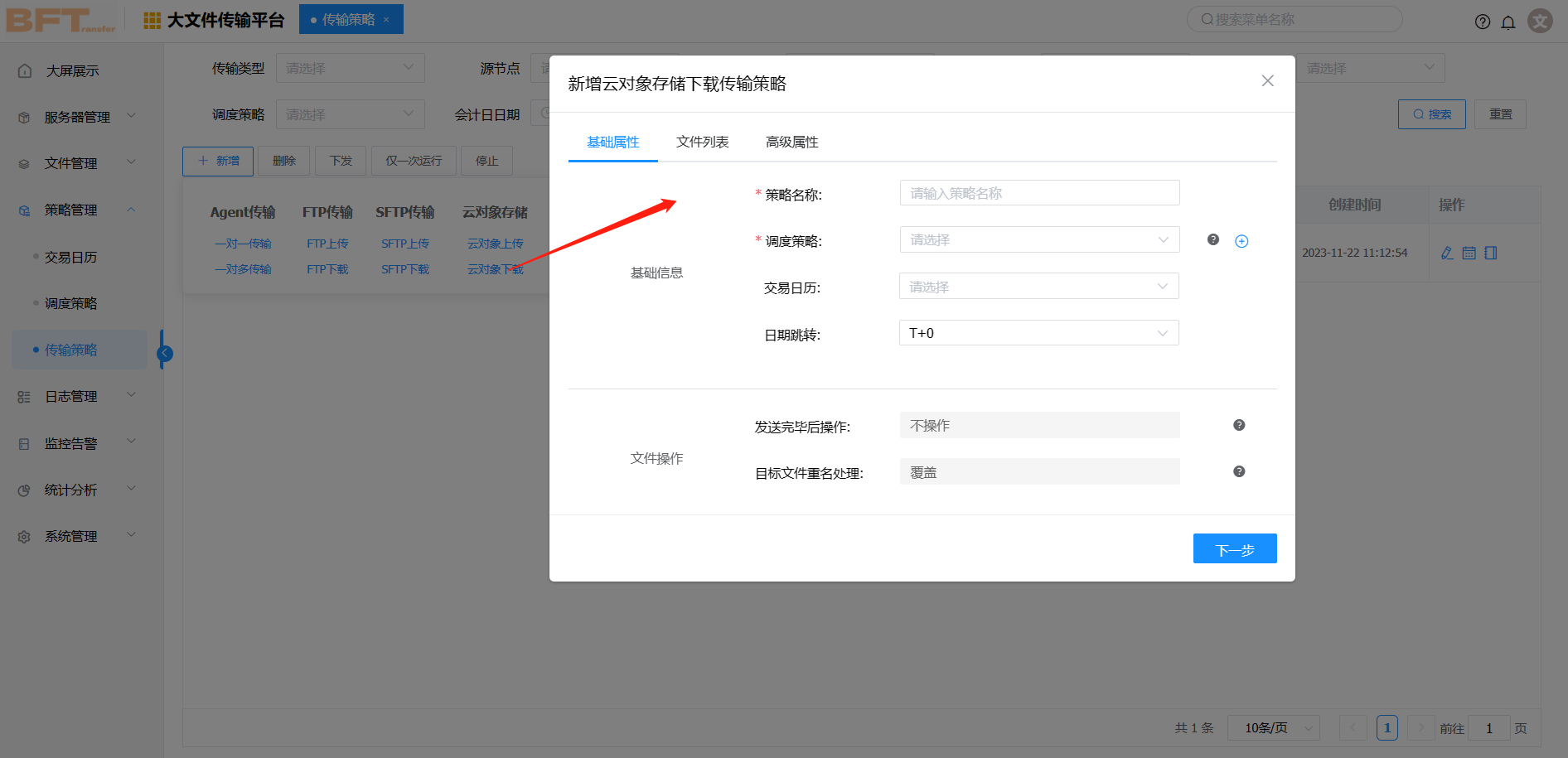 点击【新增】按钮, 选择【云对象下载】,配置传输策略。