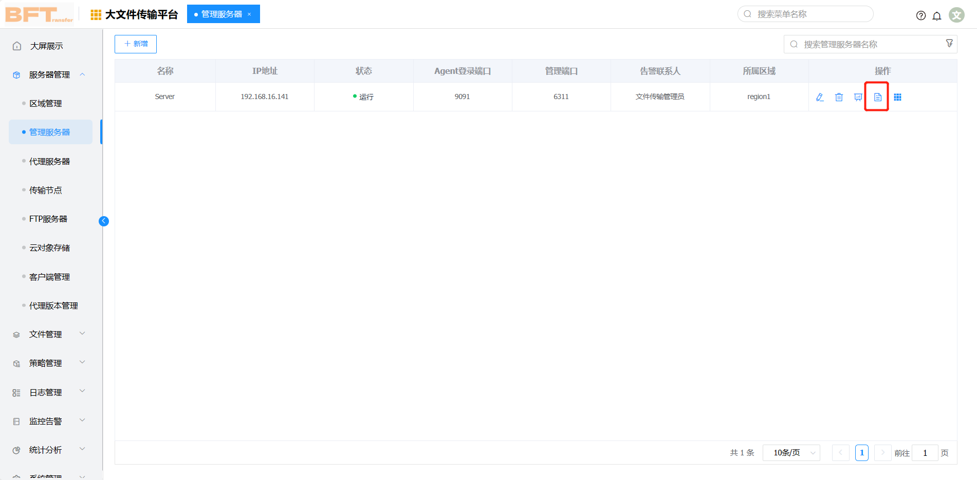 在控制管理中心进入菜单【服务器管理】>【管理服务器】,点击【托管代理节点】按钮,查看该管理节点托管的代理服务器信息。