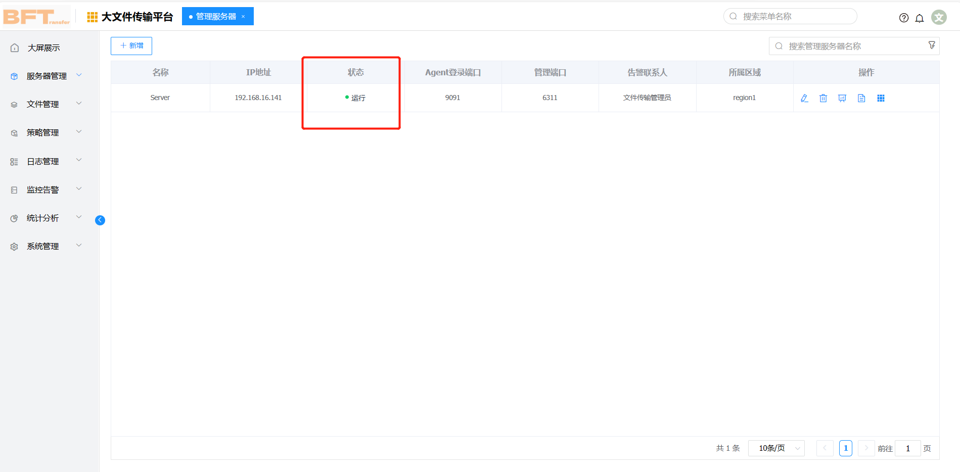 在控制管理中心进入菜单【服务器管理】>【管理服务器】,查看记录“状态”字段进行状态查看