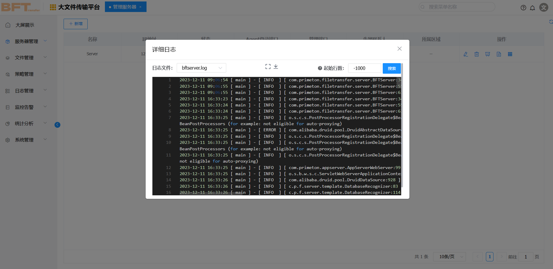 日志文件选项卡可进行系统日志文件选择,可下载管理服务器系统日志文件,可进行内容搜索。