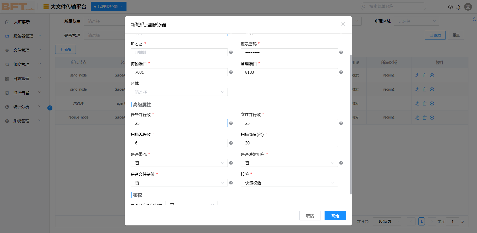 在控制管理中进入菜单【服务器管理】>【代理服务器】,点击【新增】按钮,设置代理文件并行数。