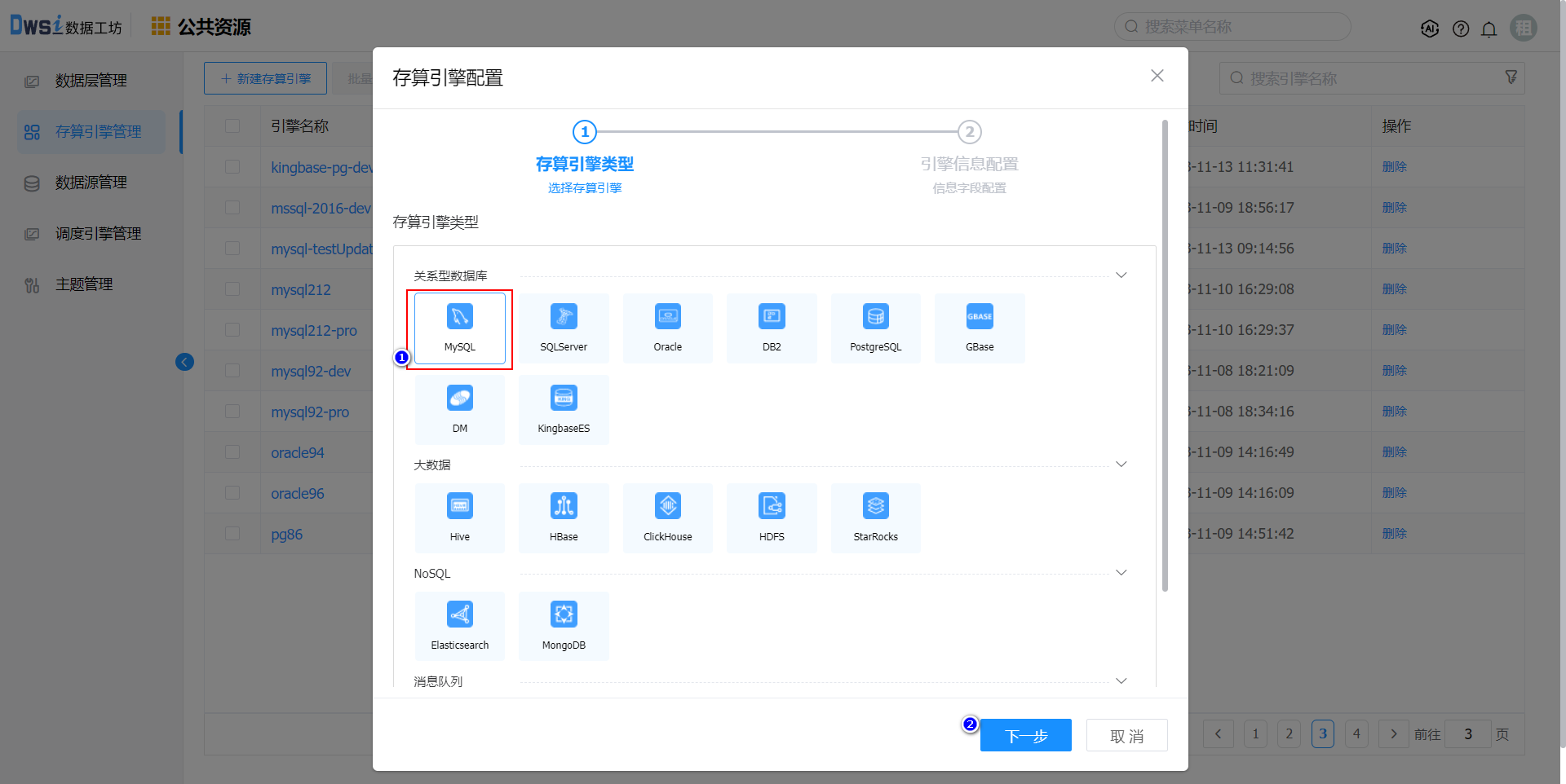 以创建MySQL类型引擎为例,点击关系型数据库分类下的MySQL图标,点击下一步,如下图。