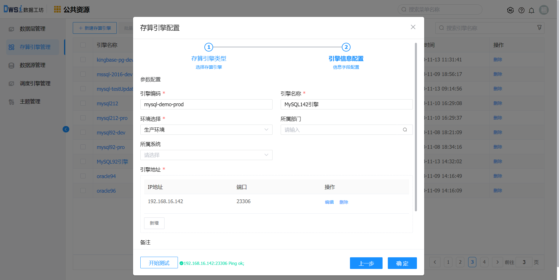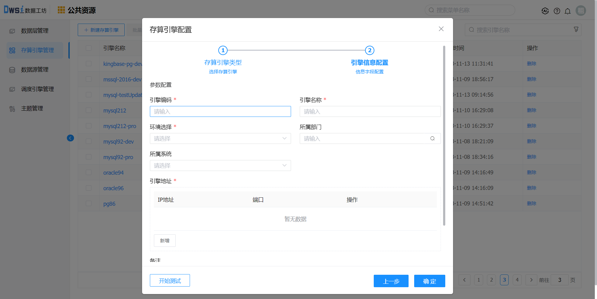 输入必填项:引擎名称、环境选择、引擎地址及引擎地址,点击开始测试按钮,测试成功后点击确定按钮保存引擎数据。