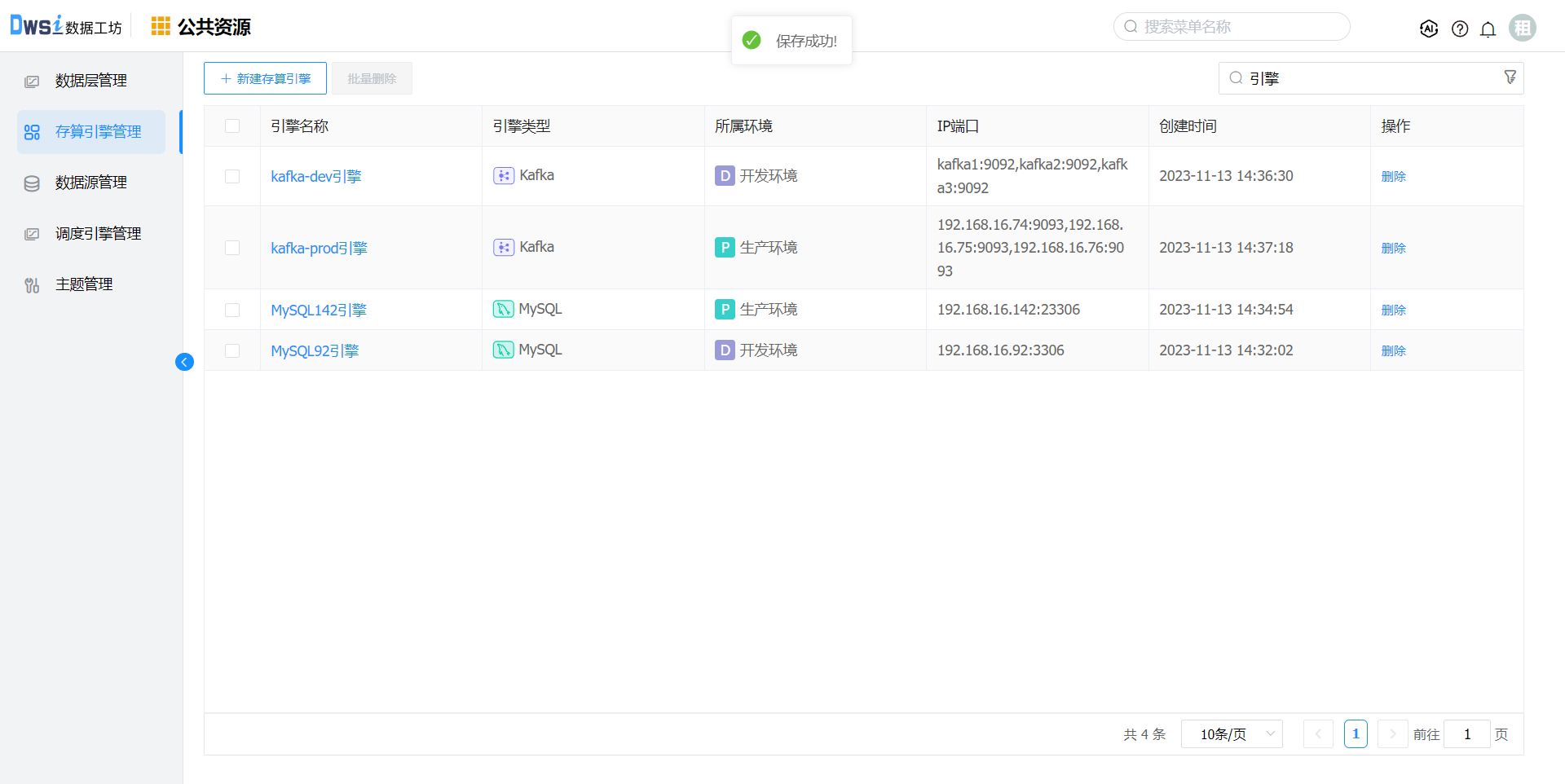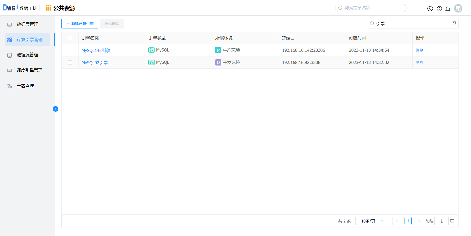 点击上方菜单栏“公共资源”,进入公共资源管理界面,点击菜单栏的"存算引擎管理",进入存算引擎管理界面。在【存算引擎管理】页面,点击"新建存算引擎"按钮。