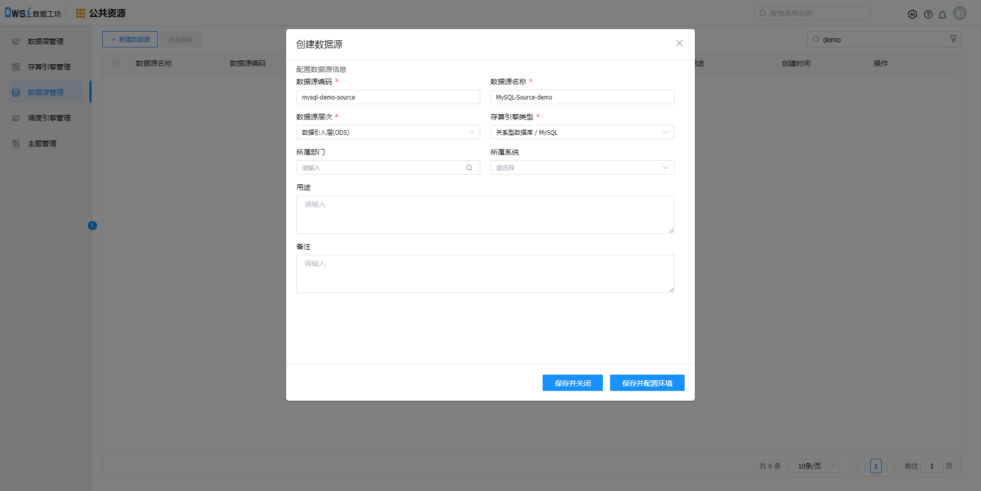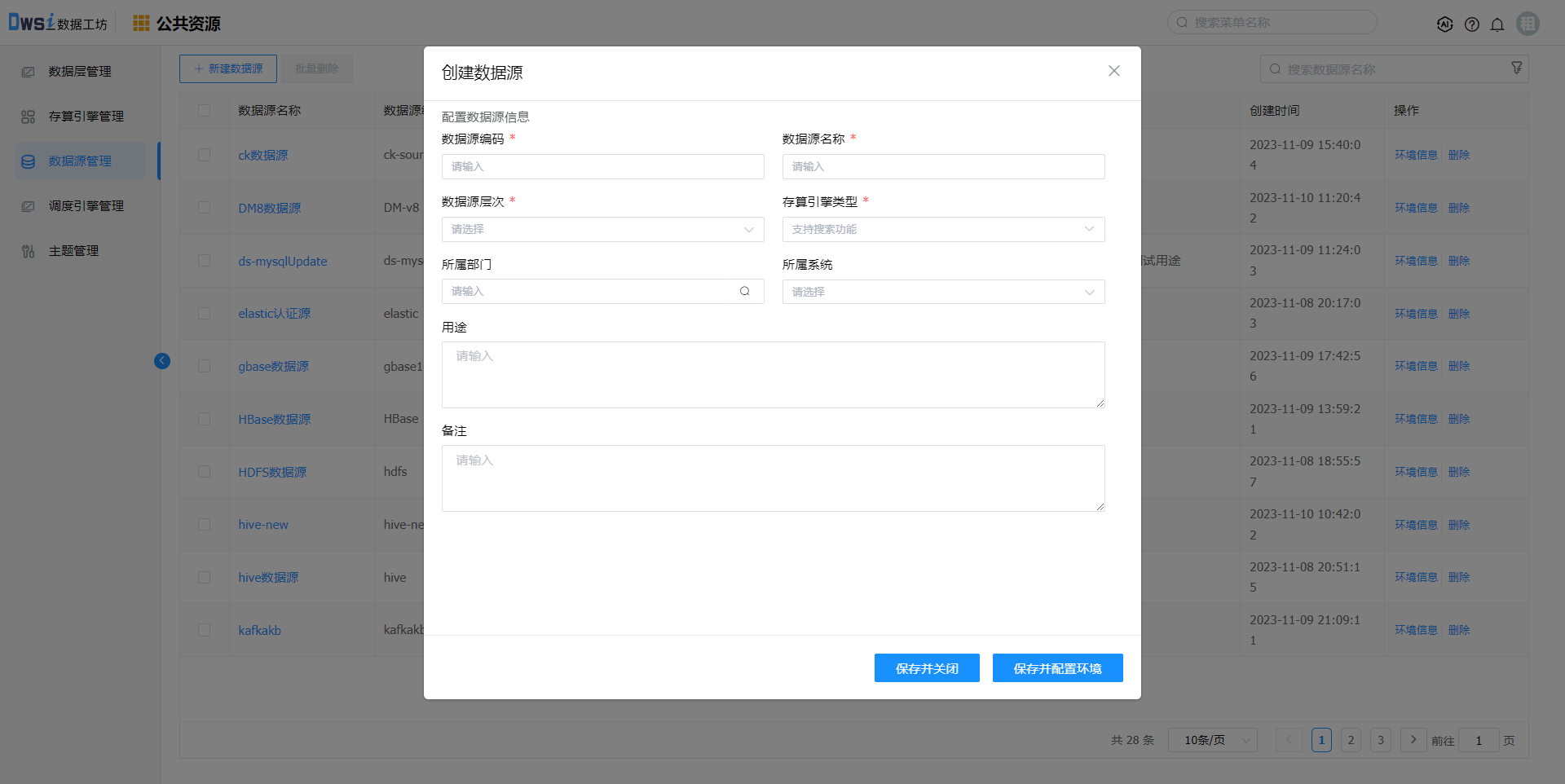 输入数据源编码、数据源名称,选择数据源层次,输入其他非必填项(可选),点击"保存并配置环境"。