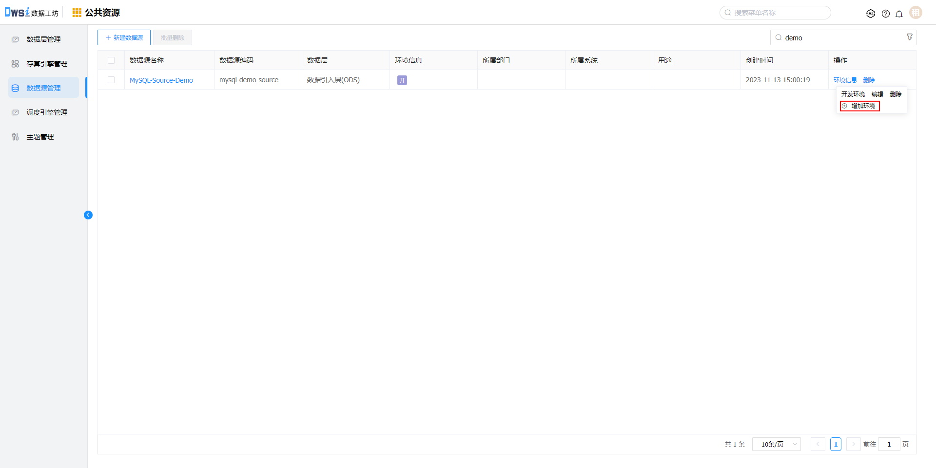 点击上方菜单栏“公共资源”,进入公共资源管理界面,点击菜单栏的"数据源管理",进入数据源管理界面。在【数据源管理】页面,点击"新建数据源"按钮。