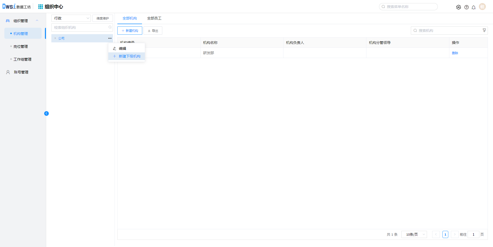 点击上方菜单栏“组织中心”,再点击【组织管理】-【机构管理】菜单,在公司下点击【新建下级机构】