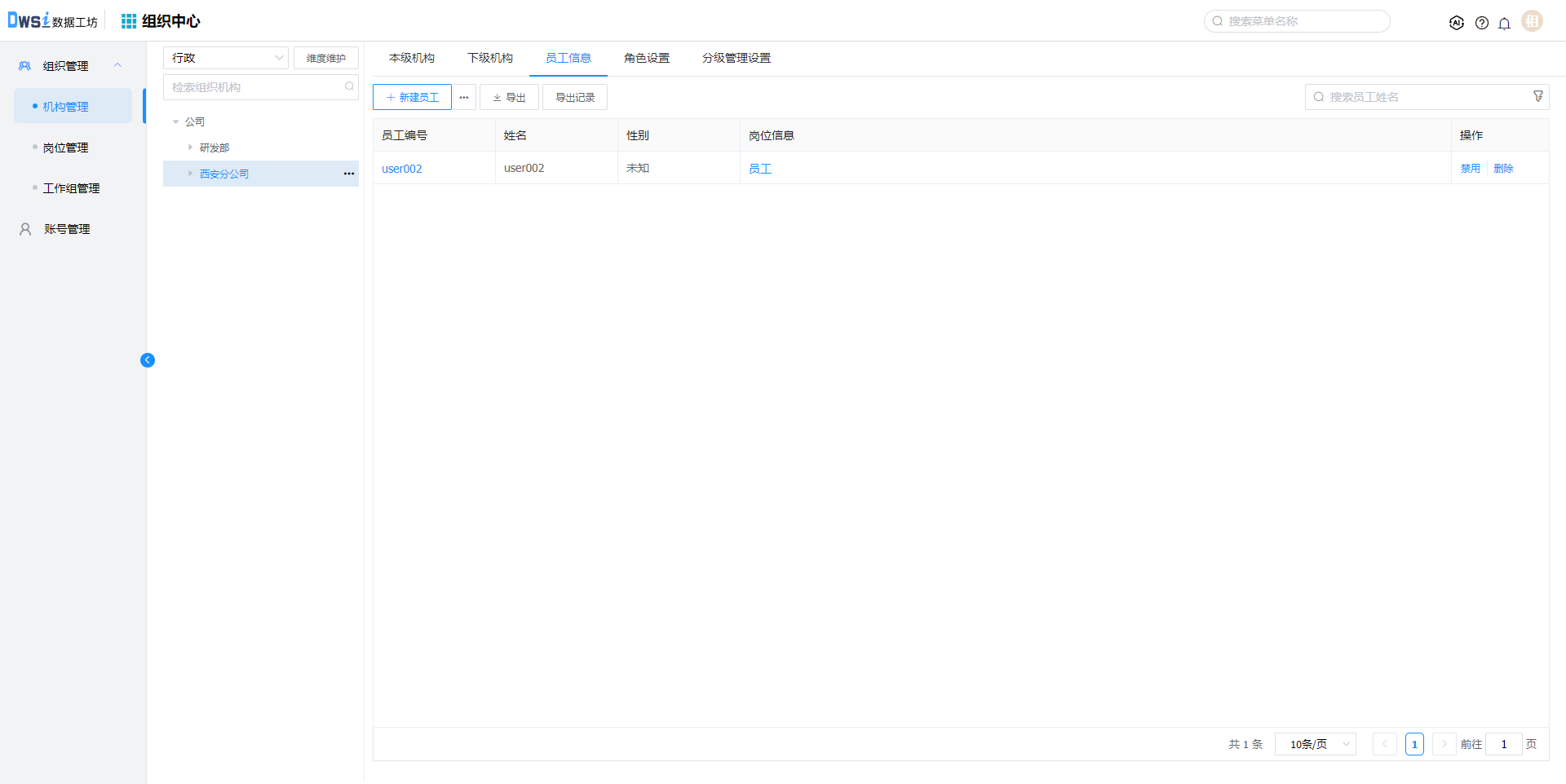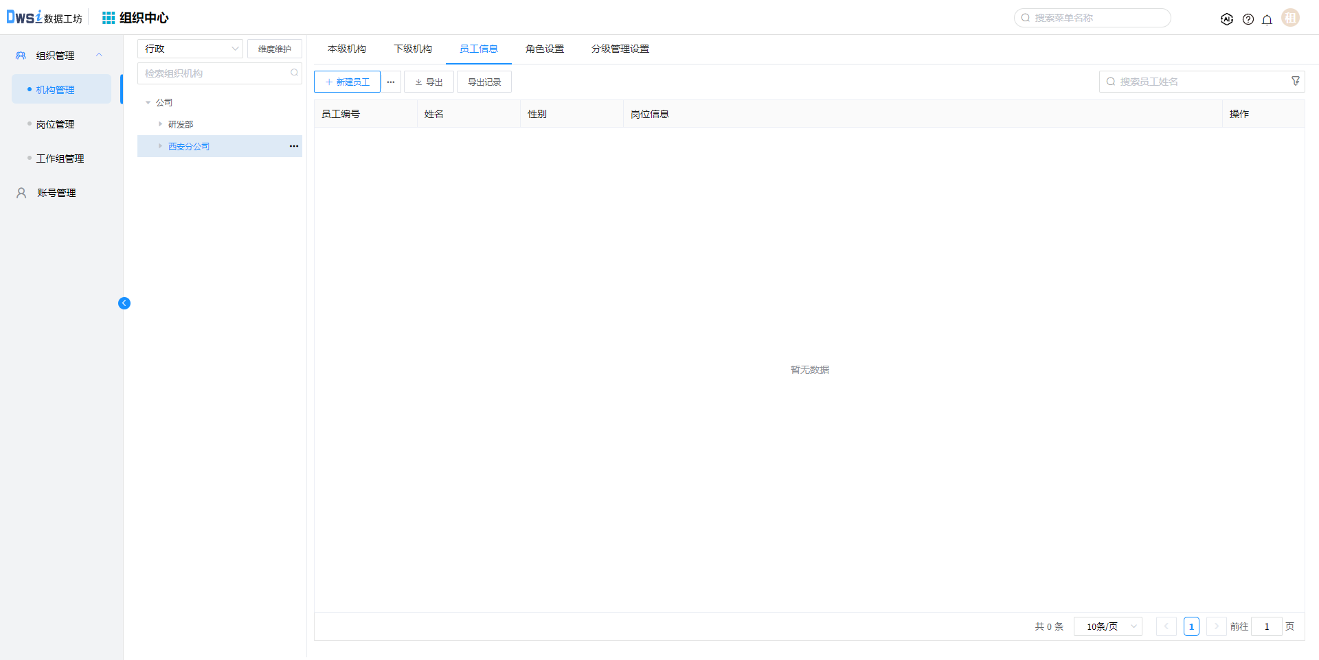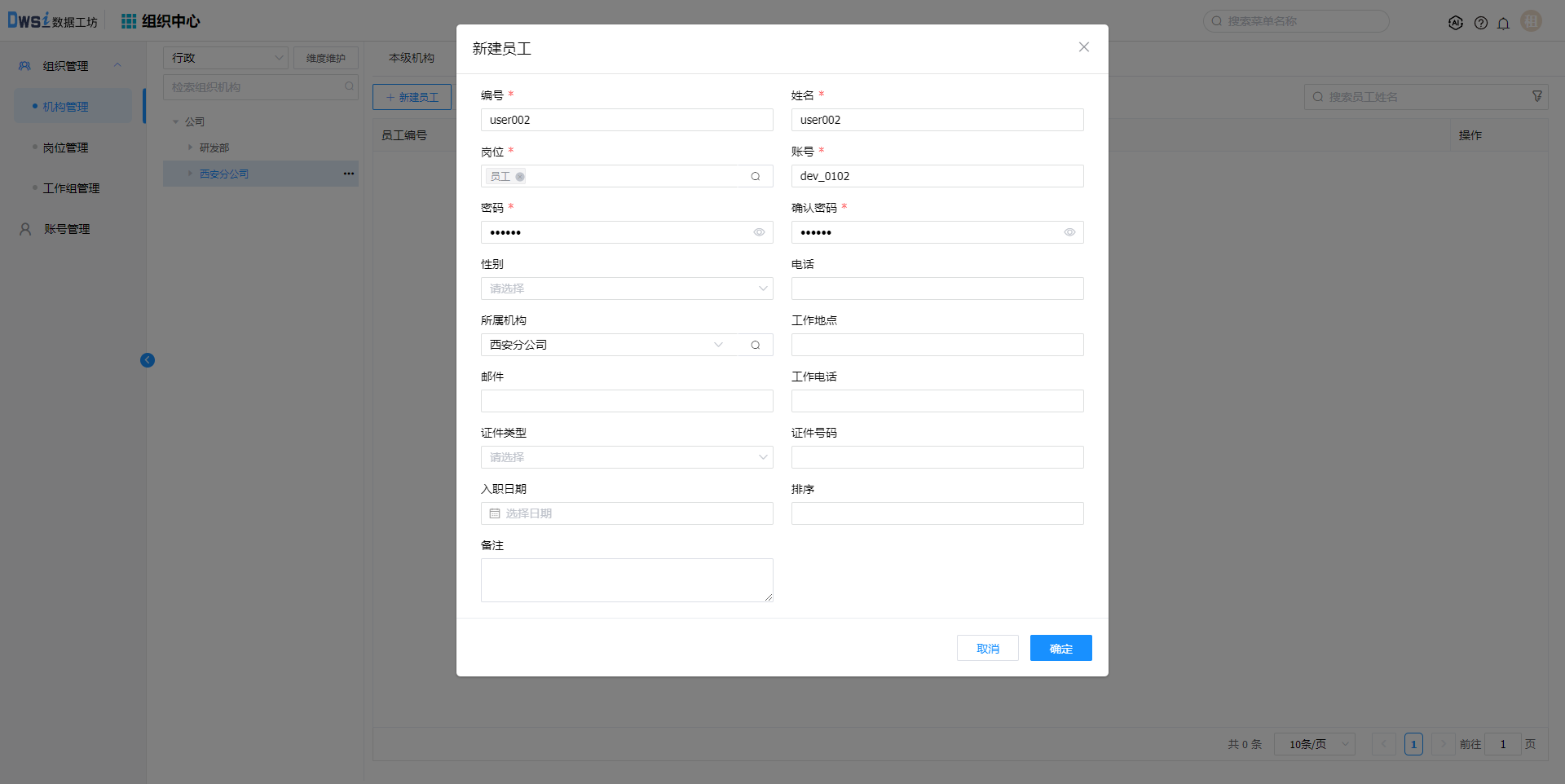 在新建的机构下, 点击【新建员工】,输入必填项后保存,员工及对应账号创建成功。