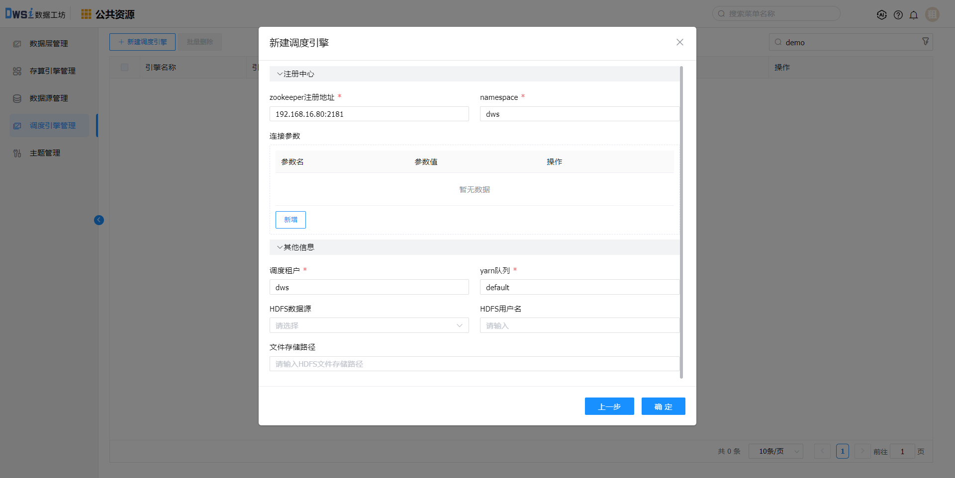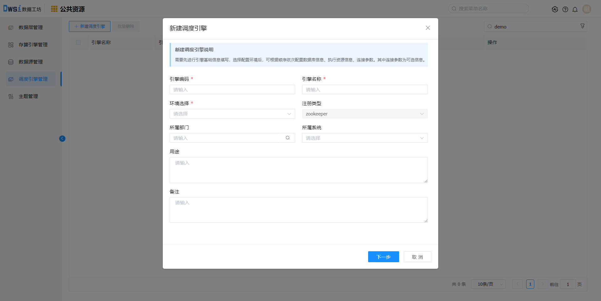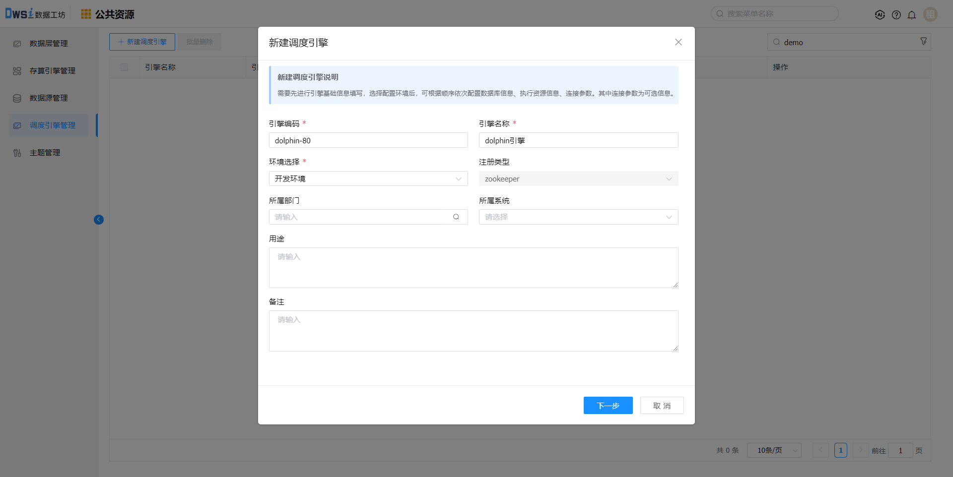 输入引擎名称、引擎编码、选择环境:开发环境,点击下一步。