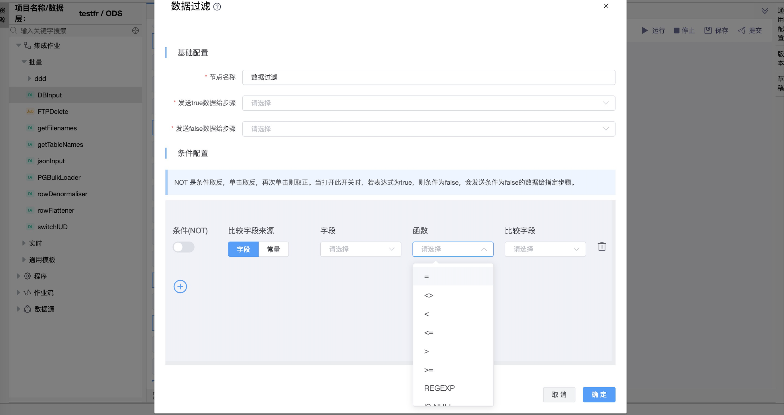 使用场景:一旦此步骤连接到前一个步骤(一个或多个接收输入),您可以单击《条件配置》中的“字段”、“函数”和“比较字段”区域来构造条件。