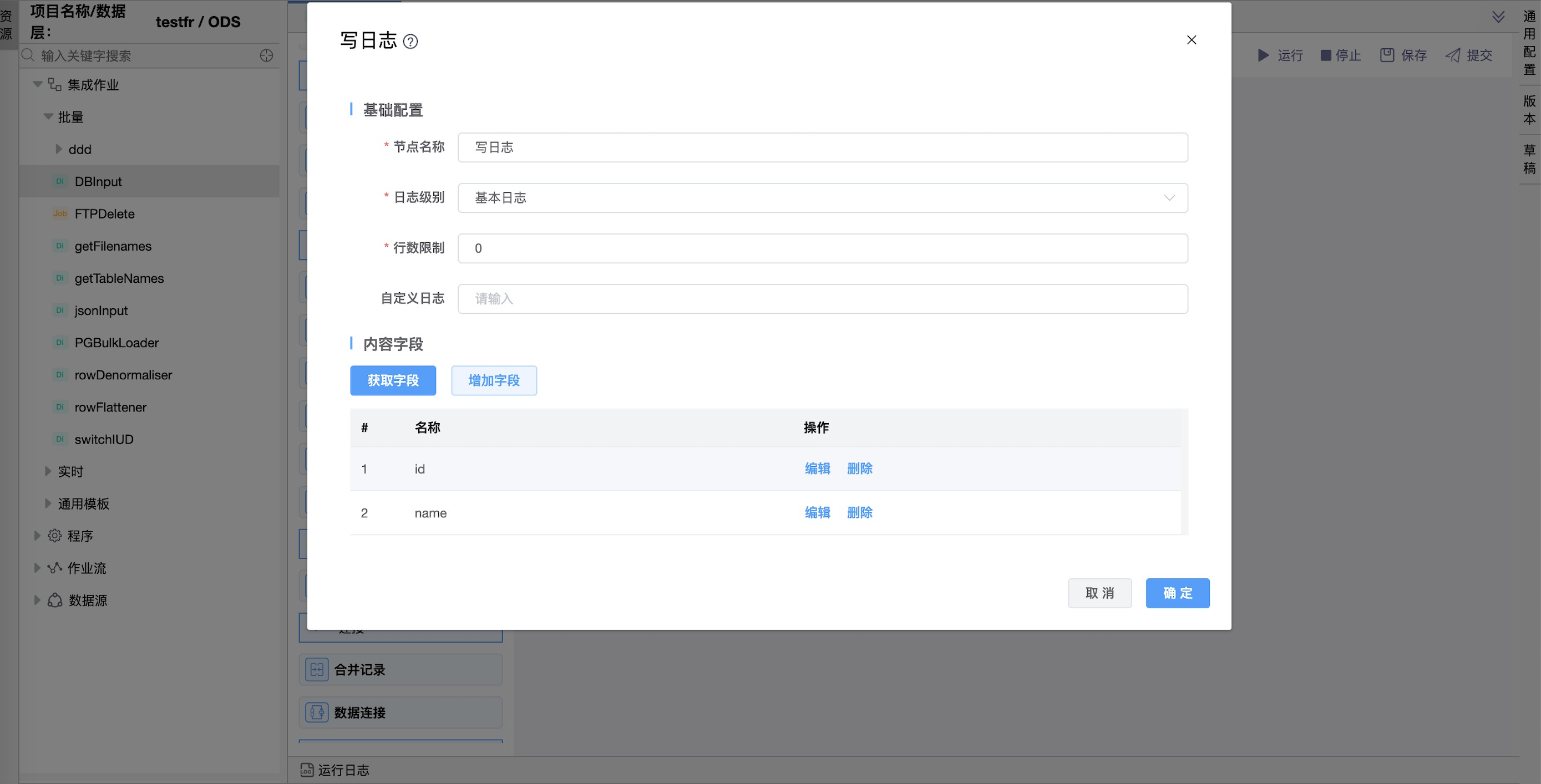 | 内容字段 | 要写入日志的字段数据。 该字段数据可自添加,也可点击“获取字段”提取上一节点输出字段。 |