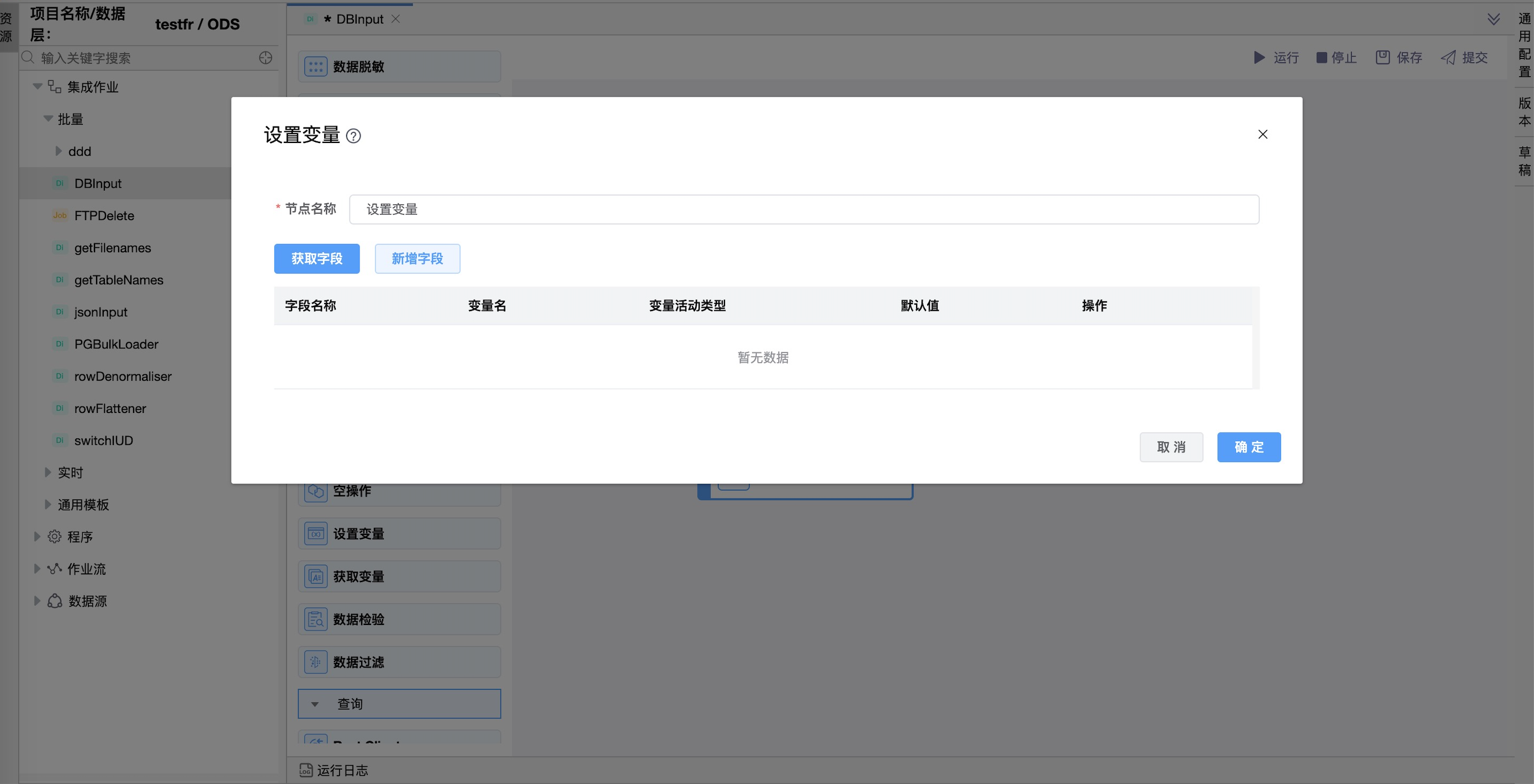 | 字段 | 字段名:可手动增加,也可以直接获取上一节点字段数据; 变量名:要设置的变量名(不带${…)}或%%…% %了相应的符号); 变量活动类型:定义变量的作用域,可选项有: - 在虚拟机中有效:整个虚拟机将知道这个变量; - 在父作业中有效:变量只在父作业中有效; - 在祖父级父级作业中有效:该变量在祖父级父级作业以及所有子作业和转换中有效; - 在根作业中有效:该变量在根作业以及所有子作业和转换中有效。 默认值:要设置的变量的默认名称。 |