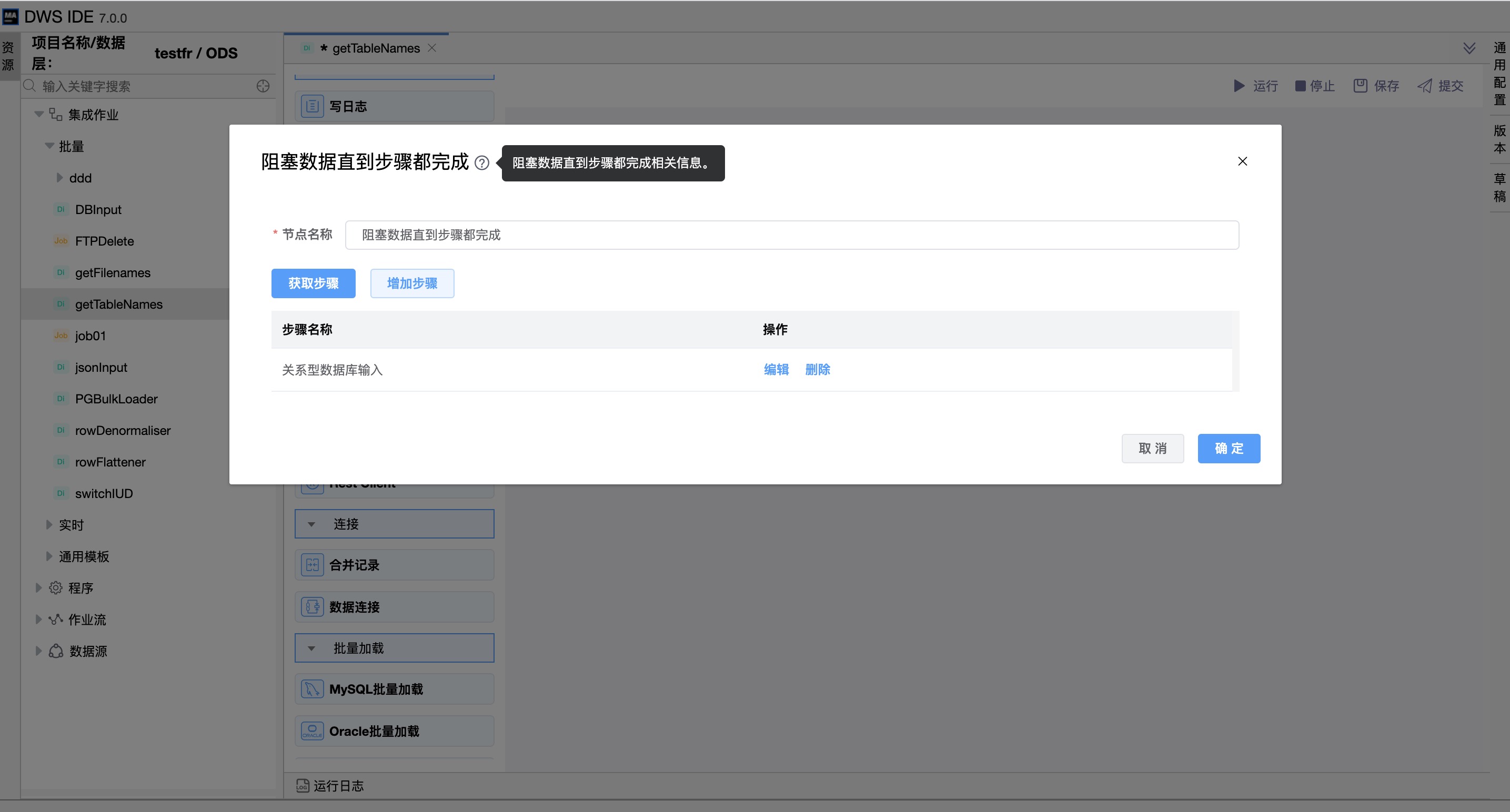 指定要等待的步骤。点击“获取步骤”自动填充步骤信息列表,其中包含转换中可用的所有步骤。