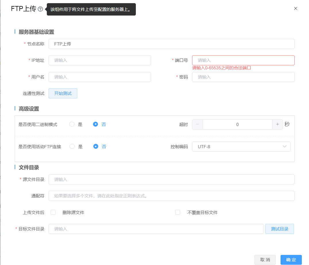 功能介绍:FTP上传用于将文件上传至配置的服务器上