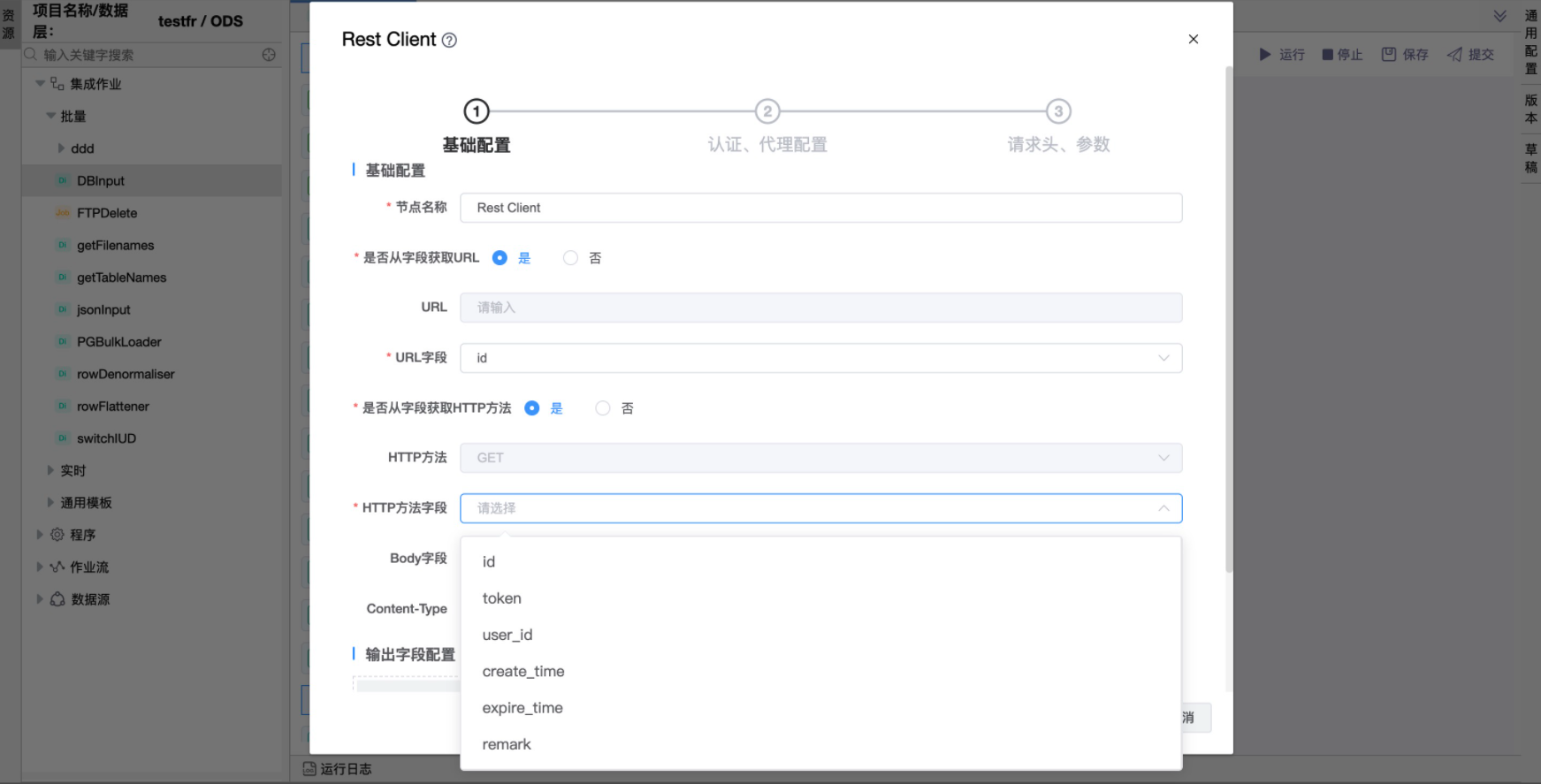 此时HTTP方法字段需要从上级节点输出的字段list中选择定义。