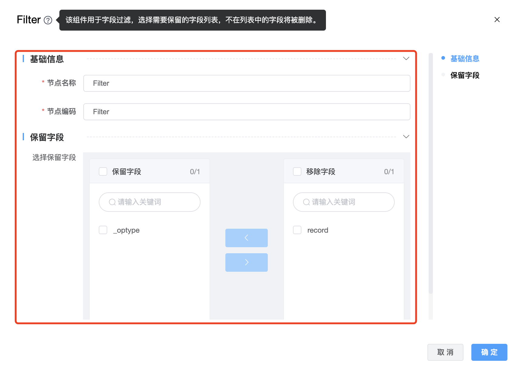 使用场景:该组件用于字段过滤,选择需要保留的字段列表,不在列表中的字段将被删除。