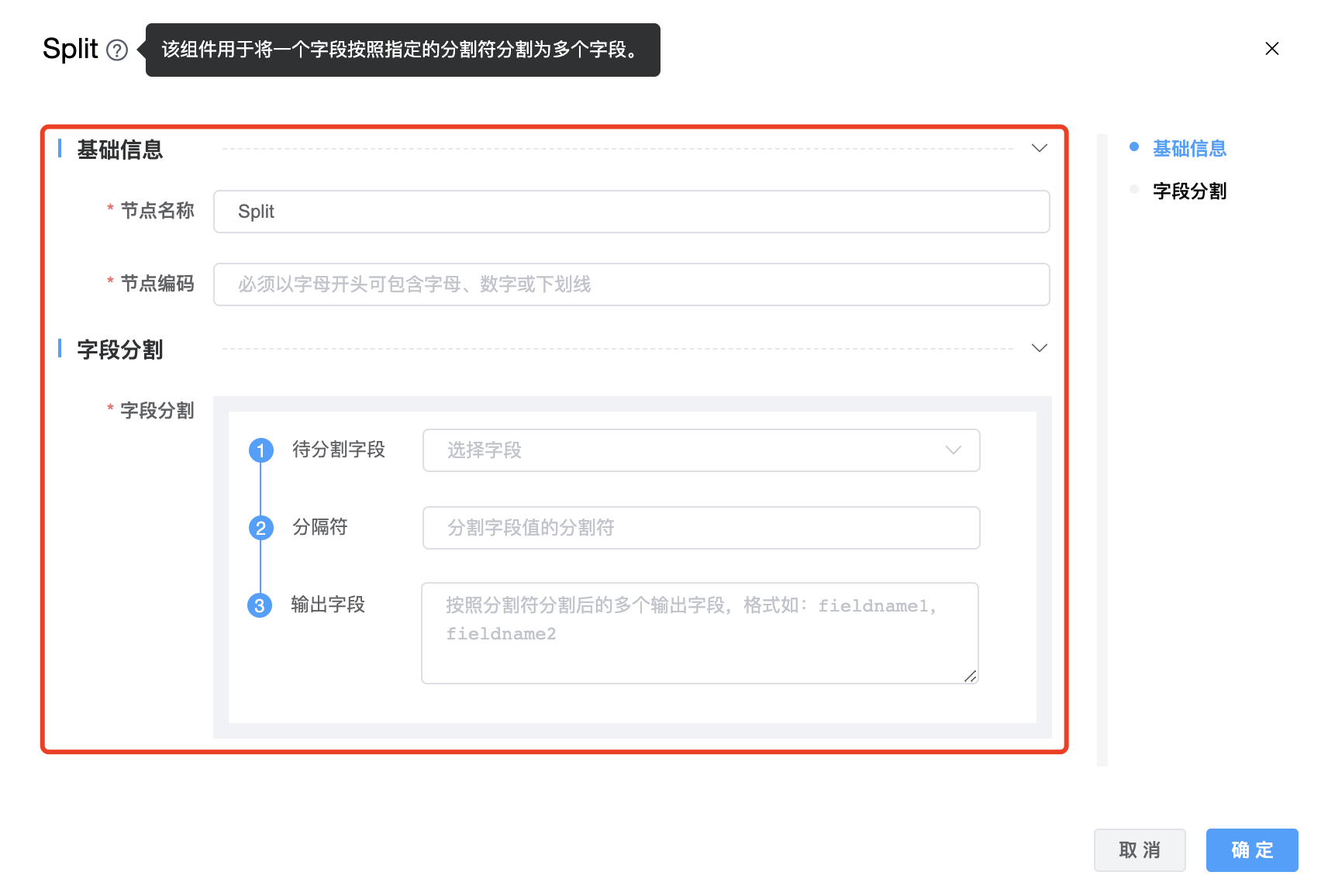 使用场景:该组件用于将一个字段按照指定的分割符分割为多个字段。