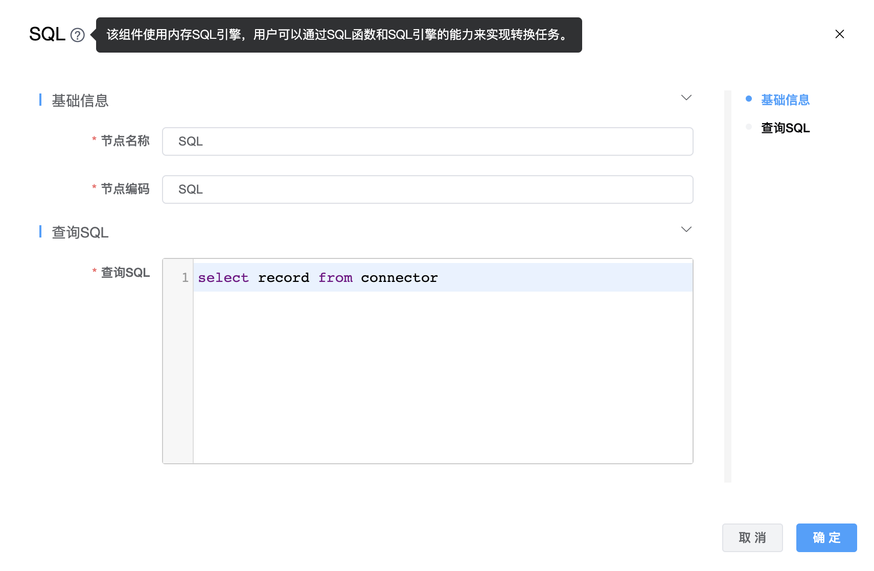 功能介绍:该组件使用内存SQL引擎,用户可以通过SQL函数和SQL引擎的能力来实现转换任务。