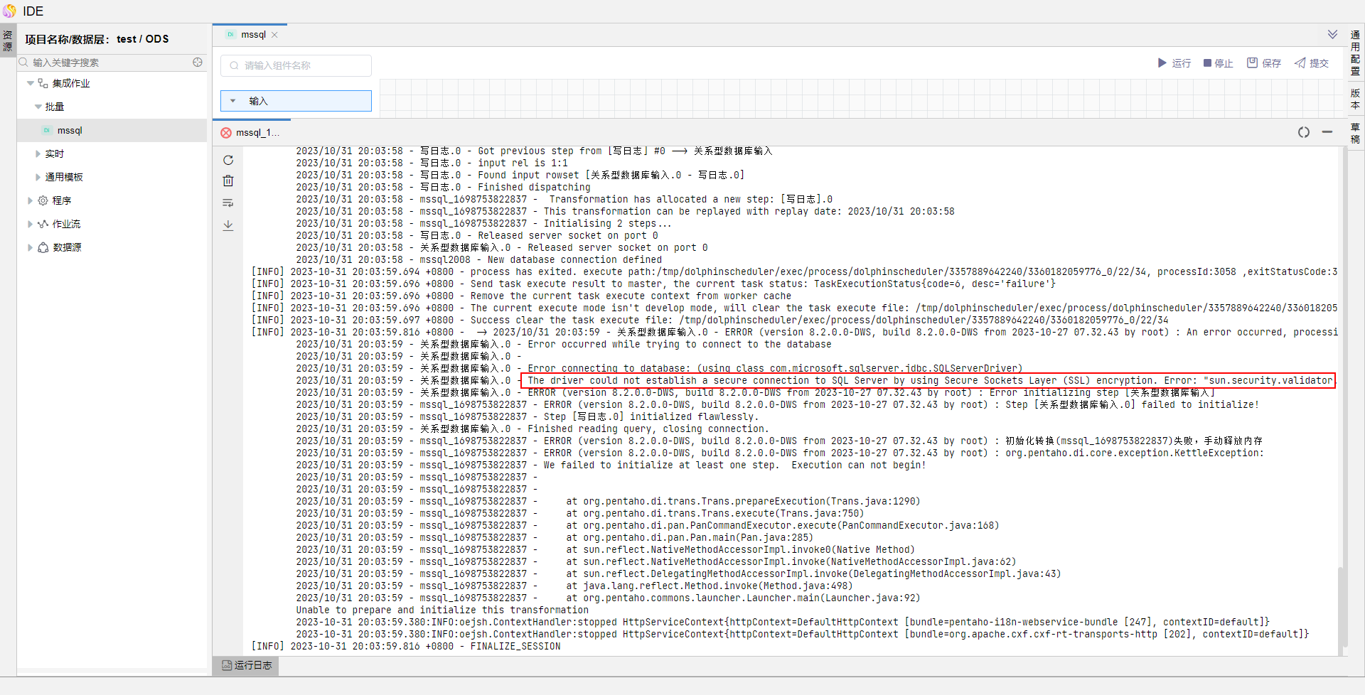 2023/10/31 11:21:08 - 关系型数据库输入.0 - at com.microsoft.sqlserver.jdbc.SQLServerException.makeFromDriverError(SQLServerException.java:237)