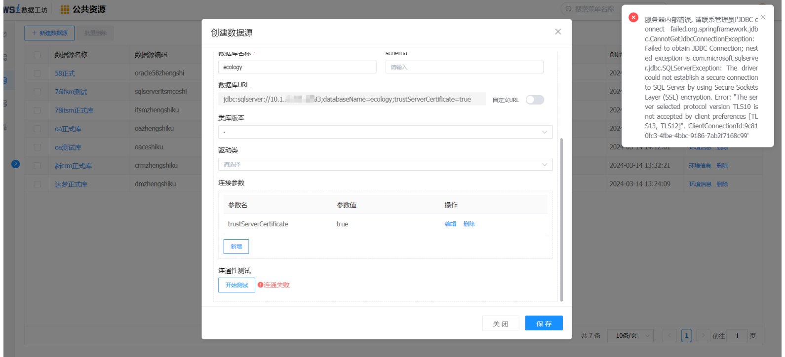 # A: 公共资源管理-数据源管理:修改数据源参数,增加 trustServerCertificate=true