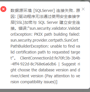 服务器内部错误,请联系管理员!JDBC connect failed.org.springframework.jdbc.CannotGetJdbcConnectionException:Failed to obtain JDBC Connection; nesed exception is com.microsoft.sqlservr.jdbc.SQLServerException: The drivercould not establish a secure connectiorto SQL Server by using Secure SocketsLayer (SSL)encryption. Error: "The se!ver selected protocol version TLS10 i.not accepted by client preferences [T!S13,TLS12]".ClientConnectionId:9c810fc3-4fbe-4bbc-9186-7ab2f7168c99'