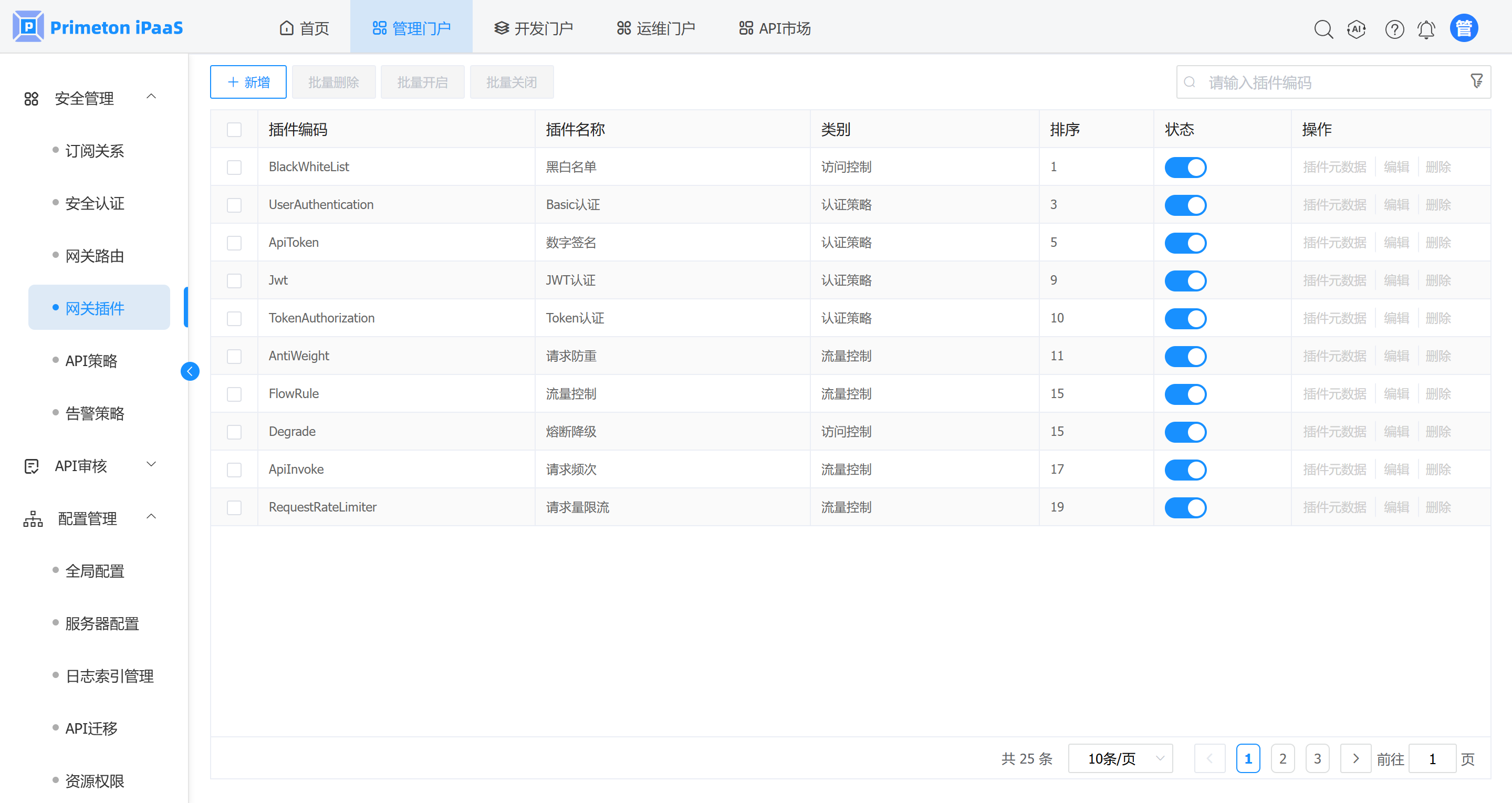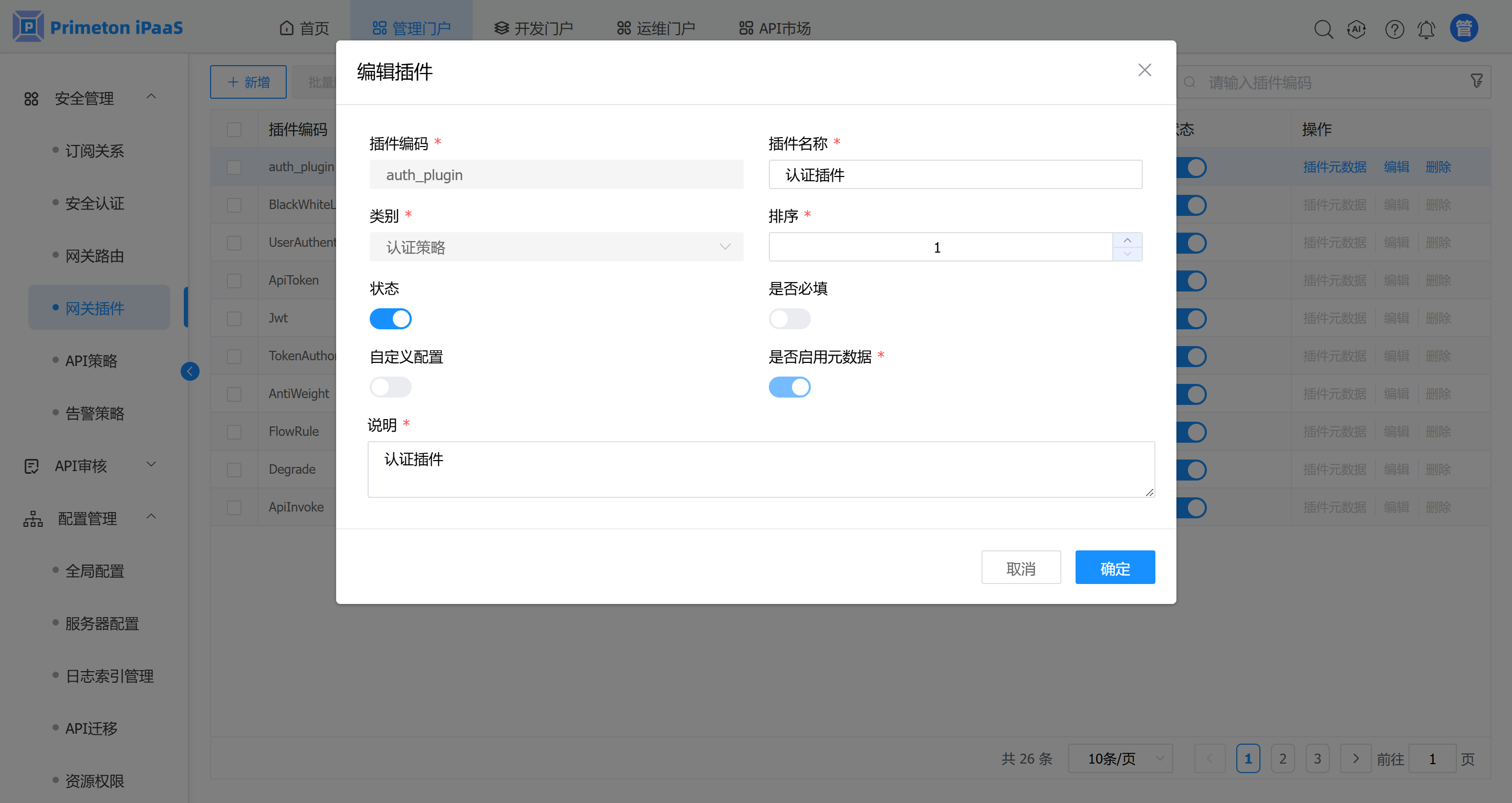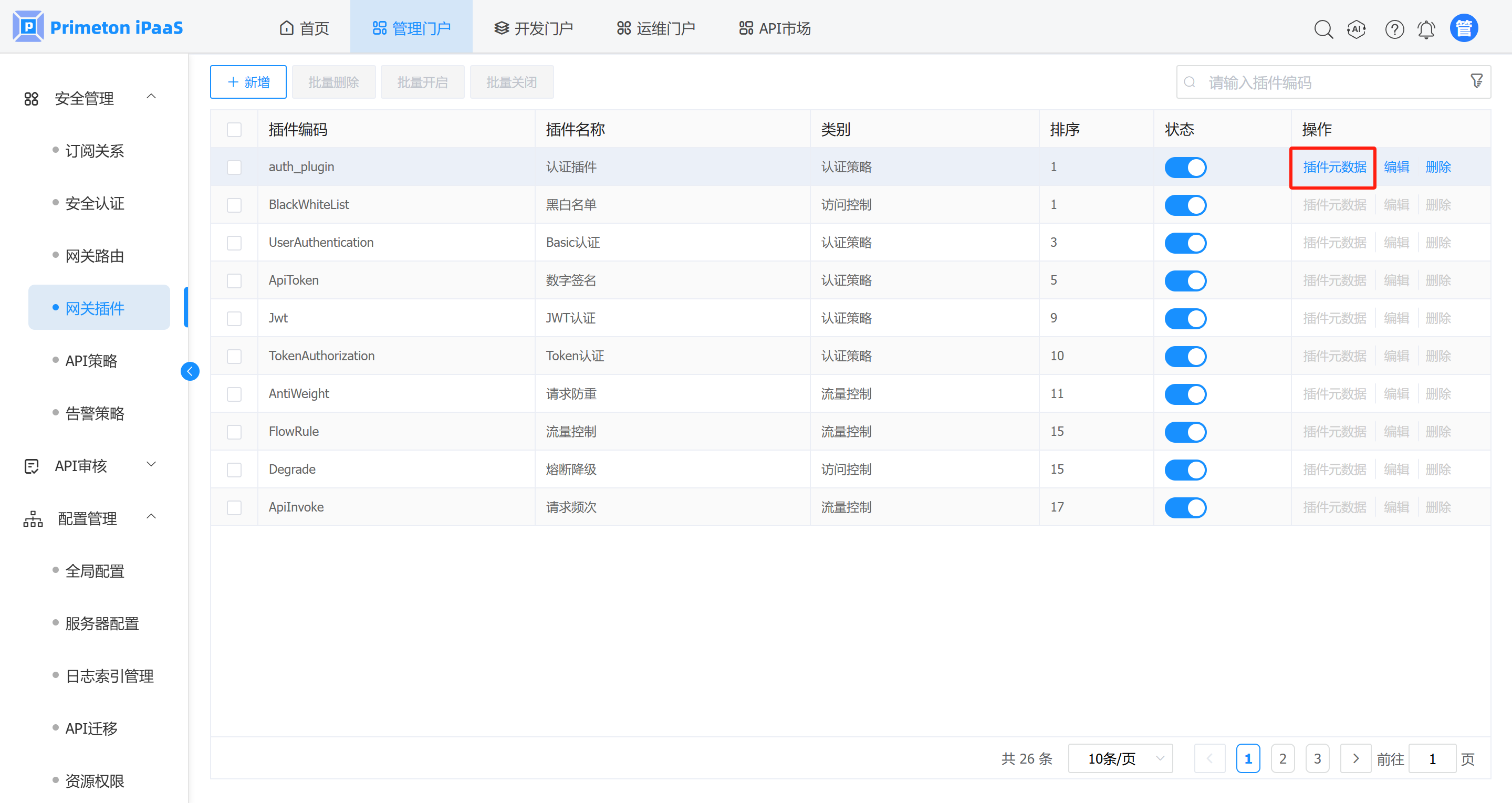 1. 在 “网关插件”管理界面,选择需要操作元数据的网关插件记录,在操作列点击“插件元数据”按钮。