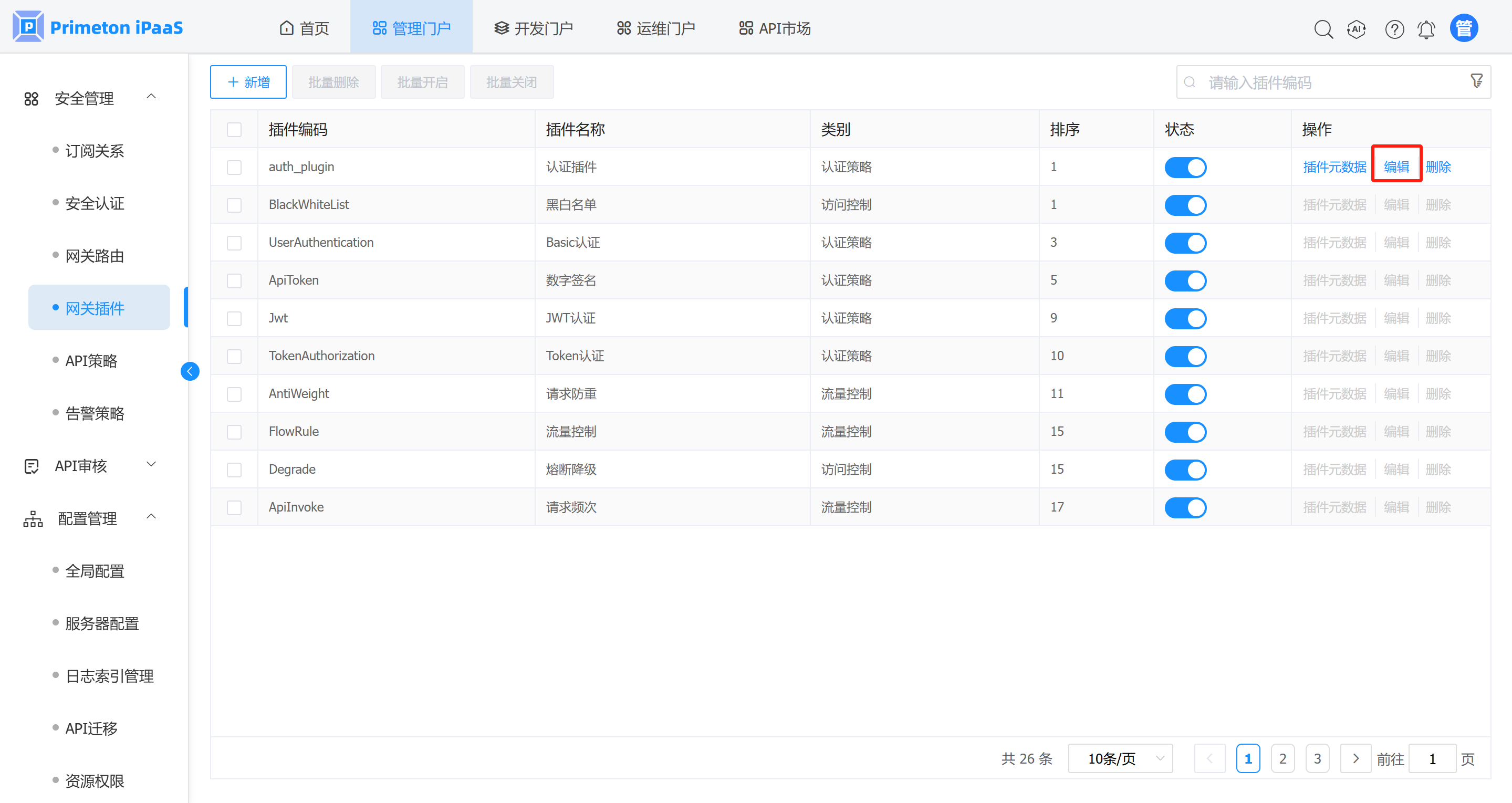 1. 在 “网关插件 ” 管理界面,选择需要编辑的网关插件记录,在操作列点击“编辑”按钮。