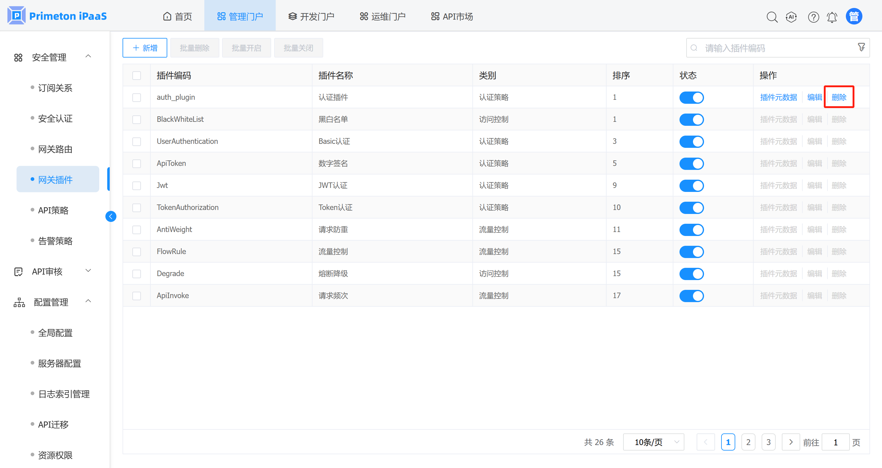 删除操作: 只有用户新增的插件才可以删除,系统内置插件无法删除。