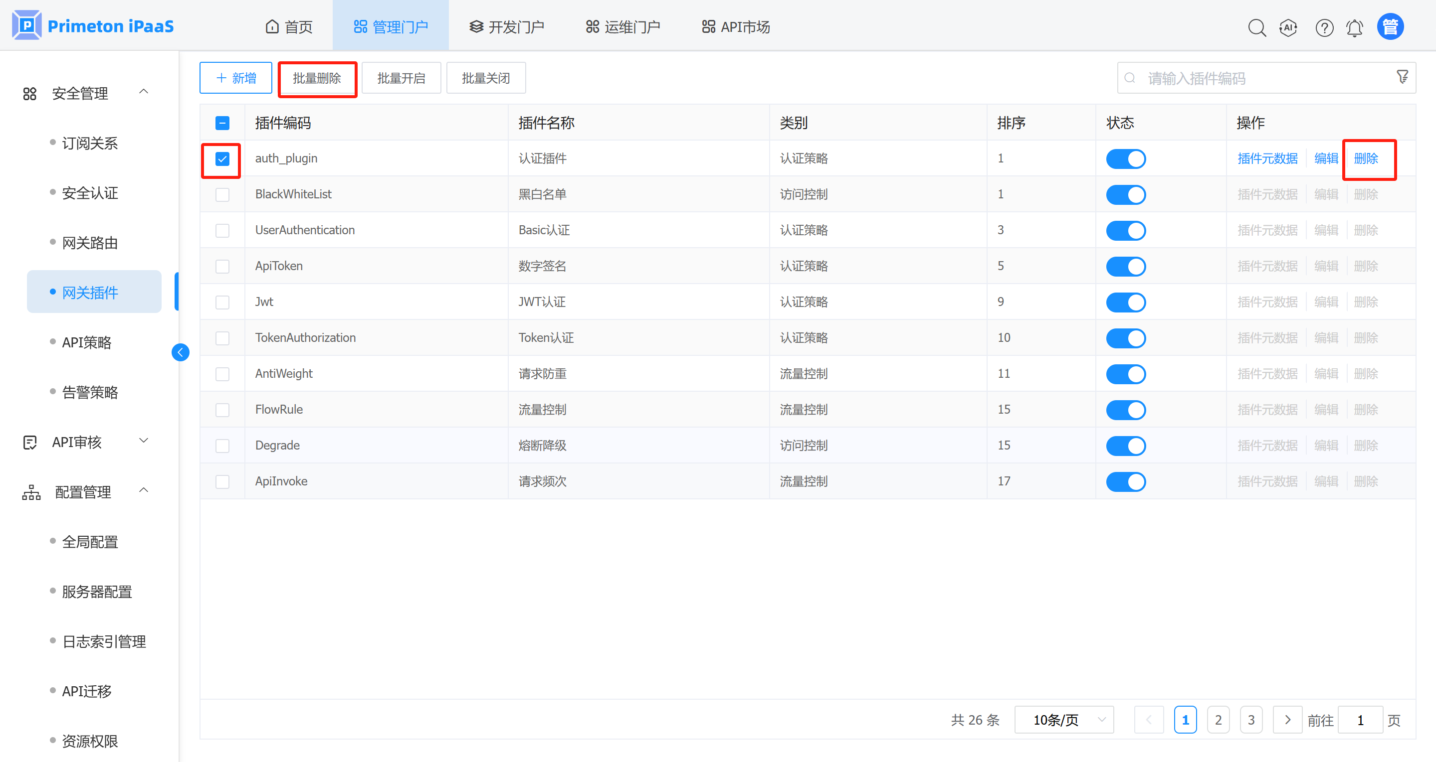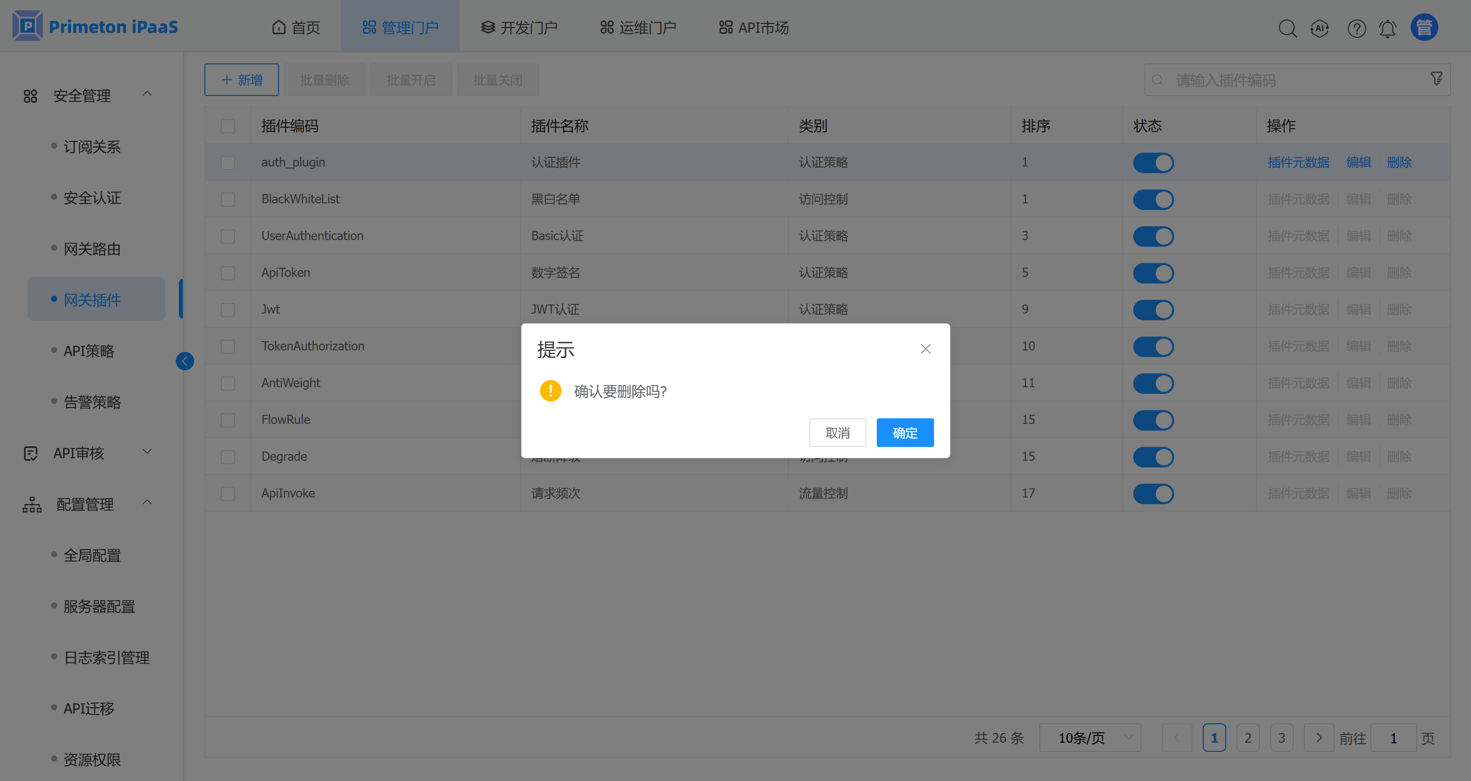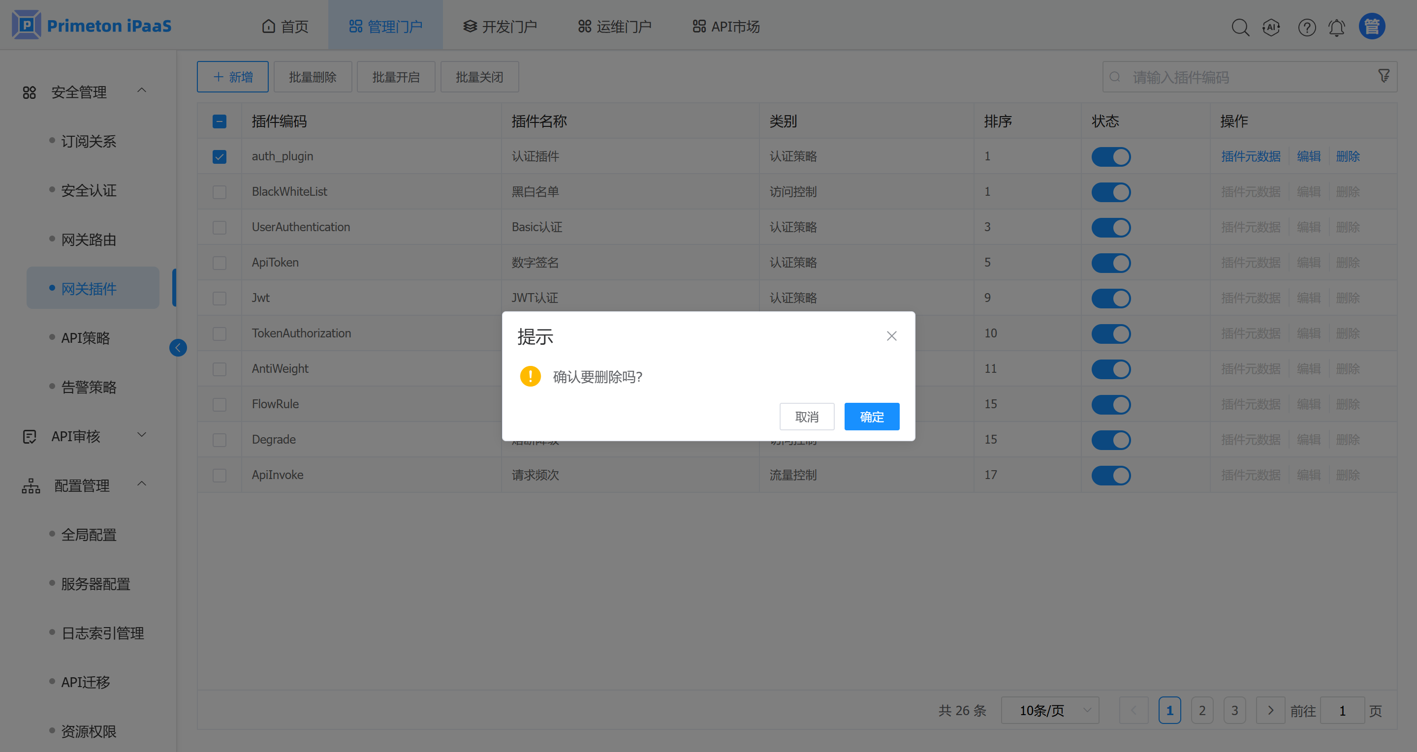 1. 在网关插件管理界面,选择需要删除的插件,点击“批量删除”按钮,弹出确认提示框。