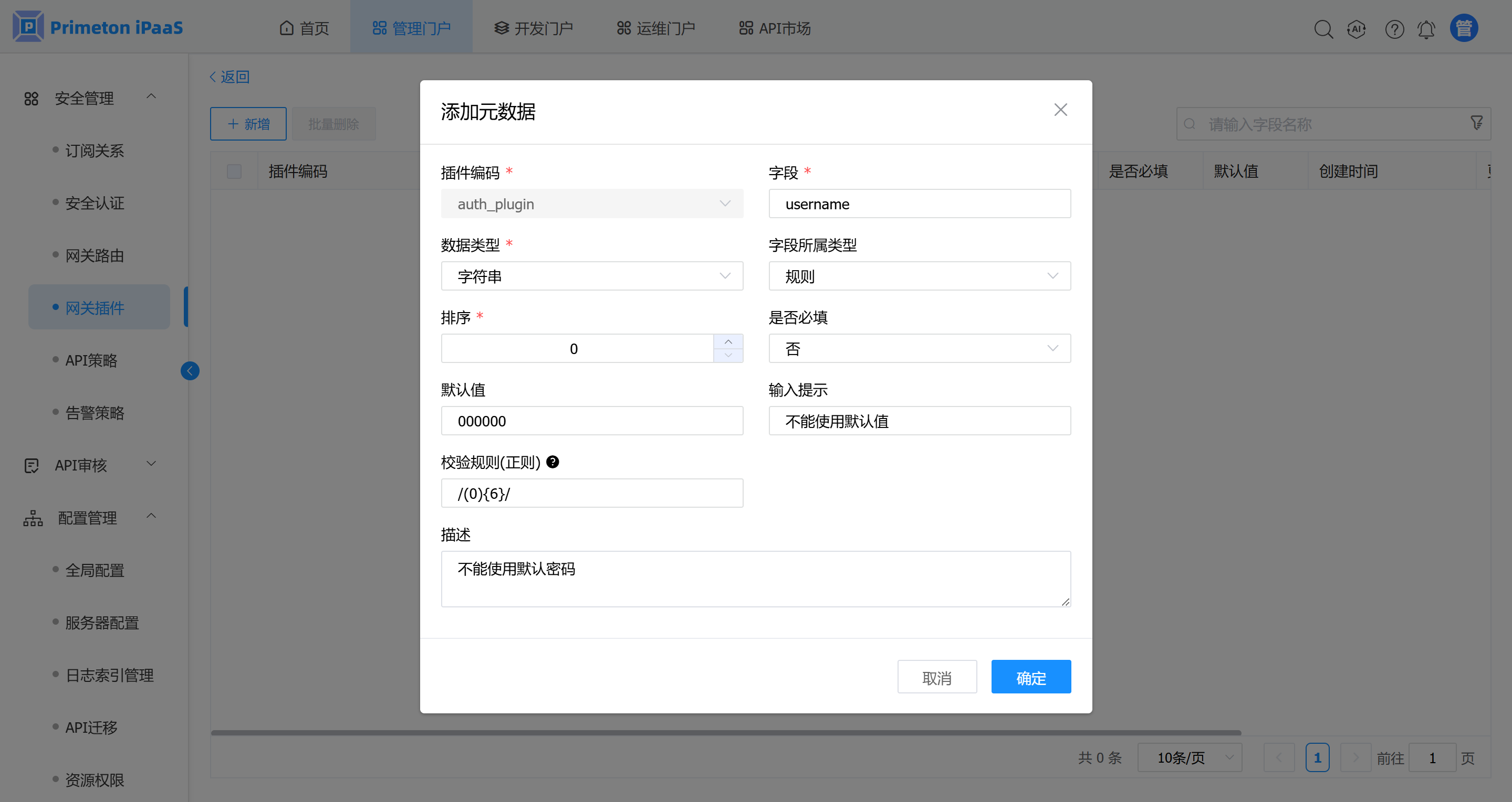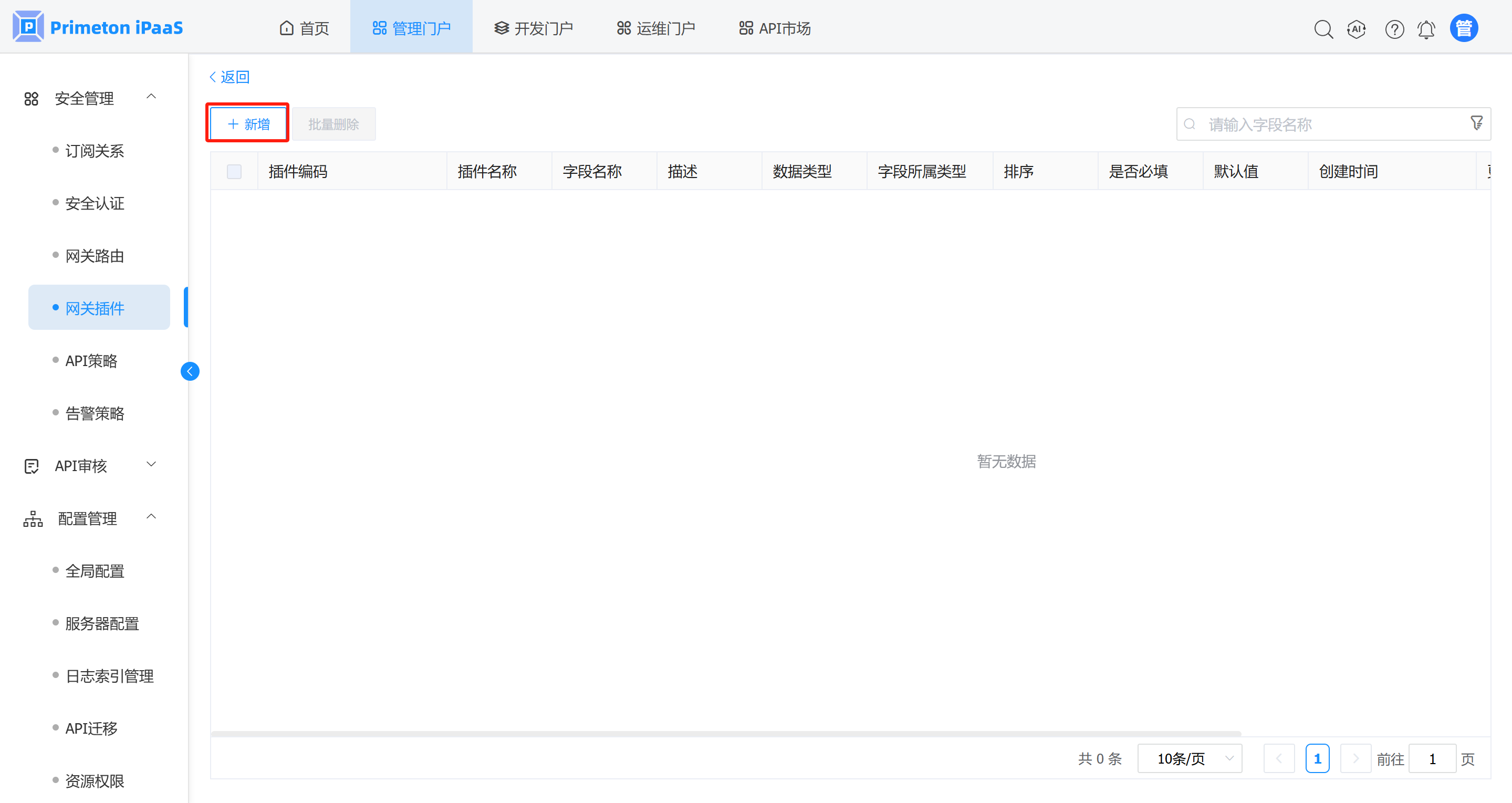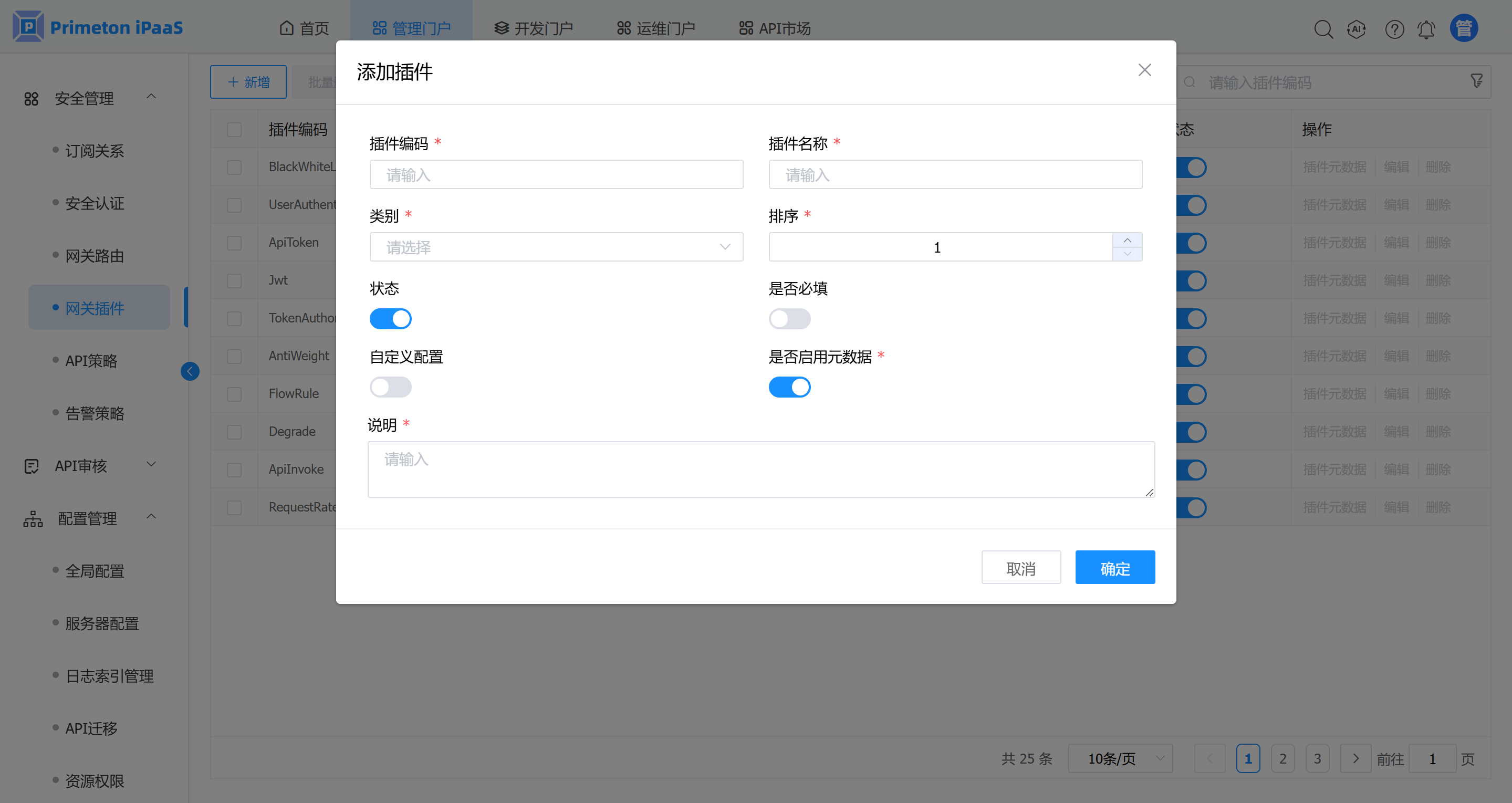 1. 在 “网关插件元数据” 管理界面,点击“新增”按钮,进入新增插件元数据界面。