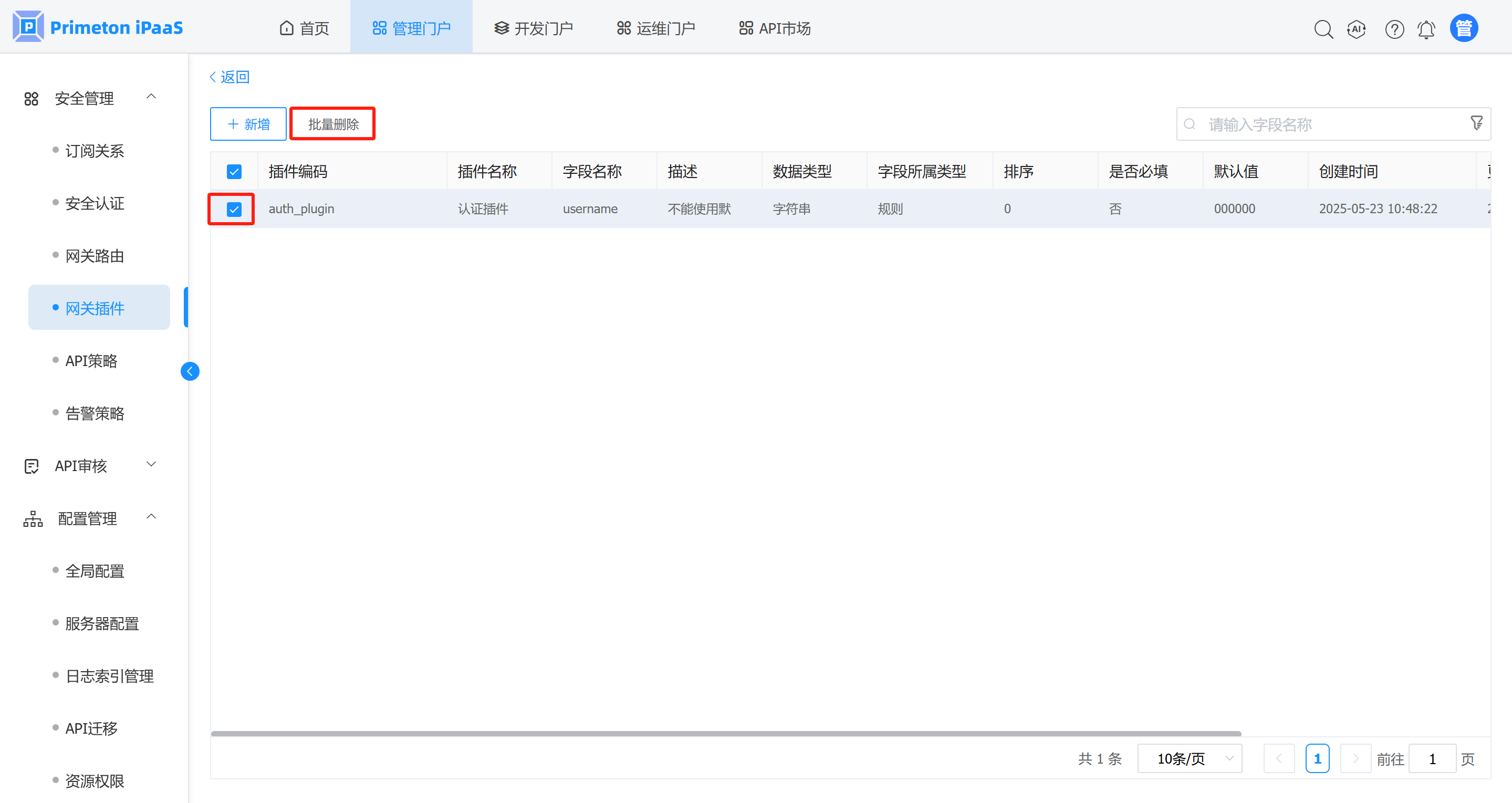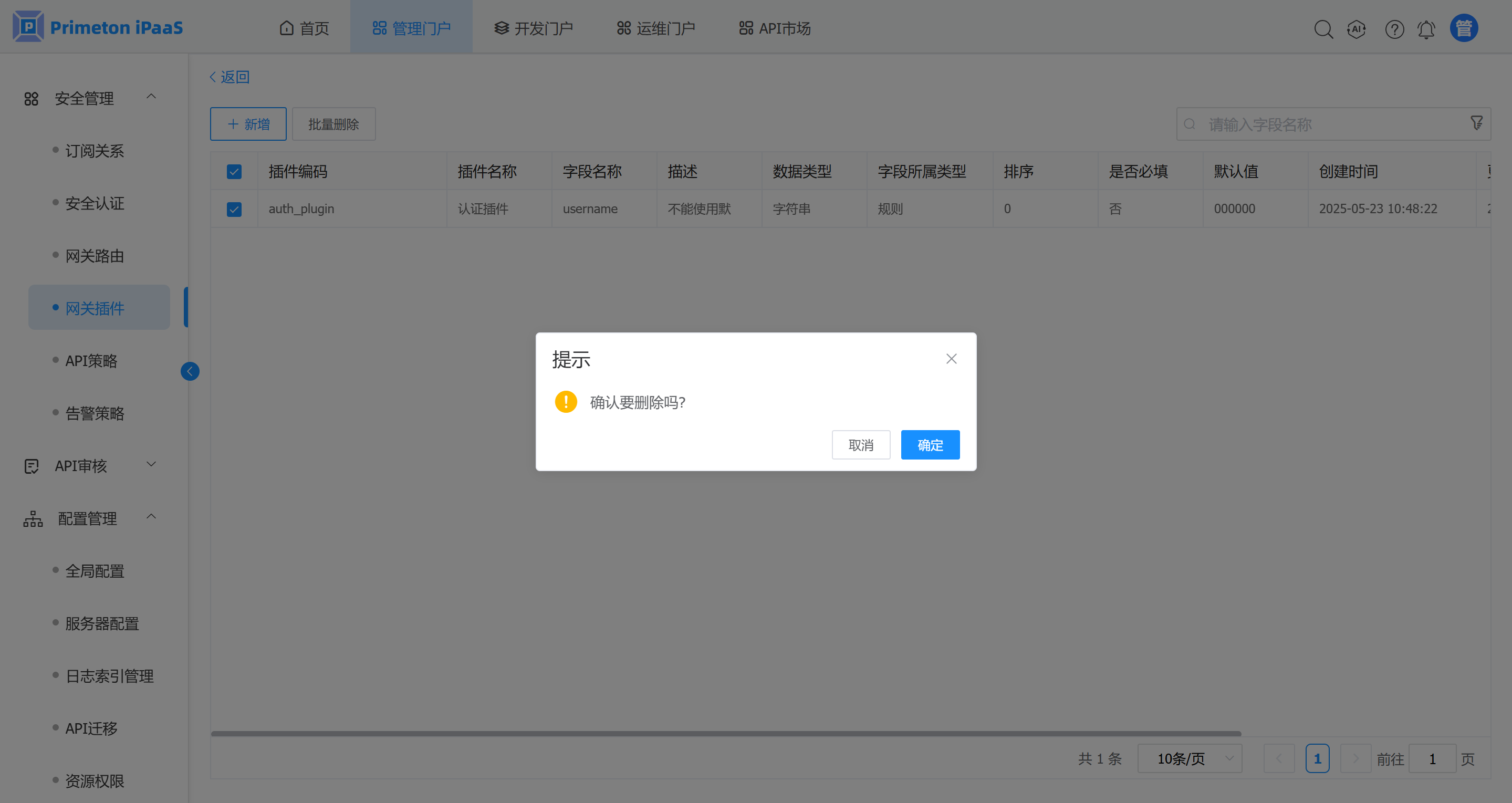 1. “网关插件元数据” 管理界面,选择需要删除的网关插件元数据记录,点击“批量删除”按钮,弹出删除提示框。