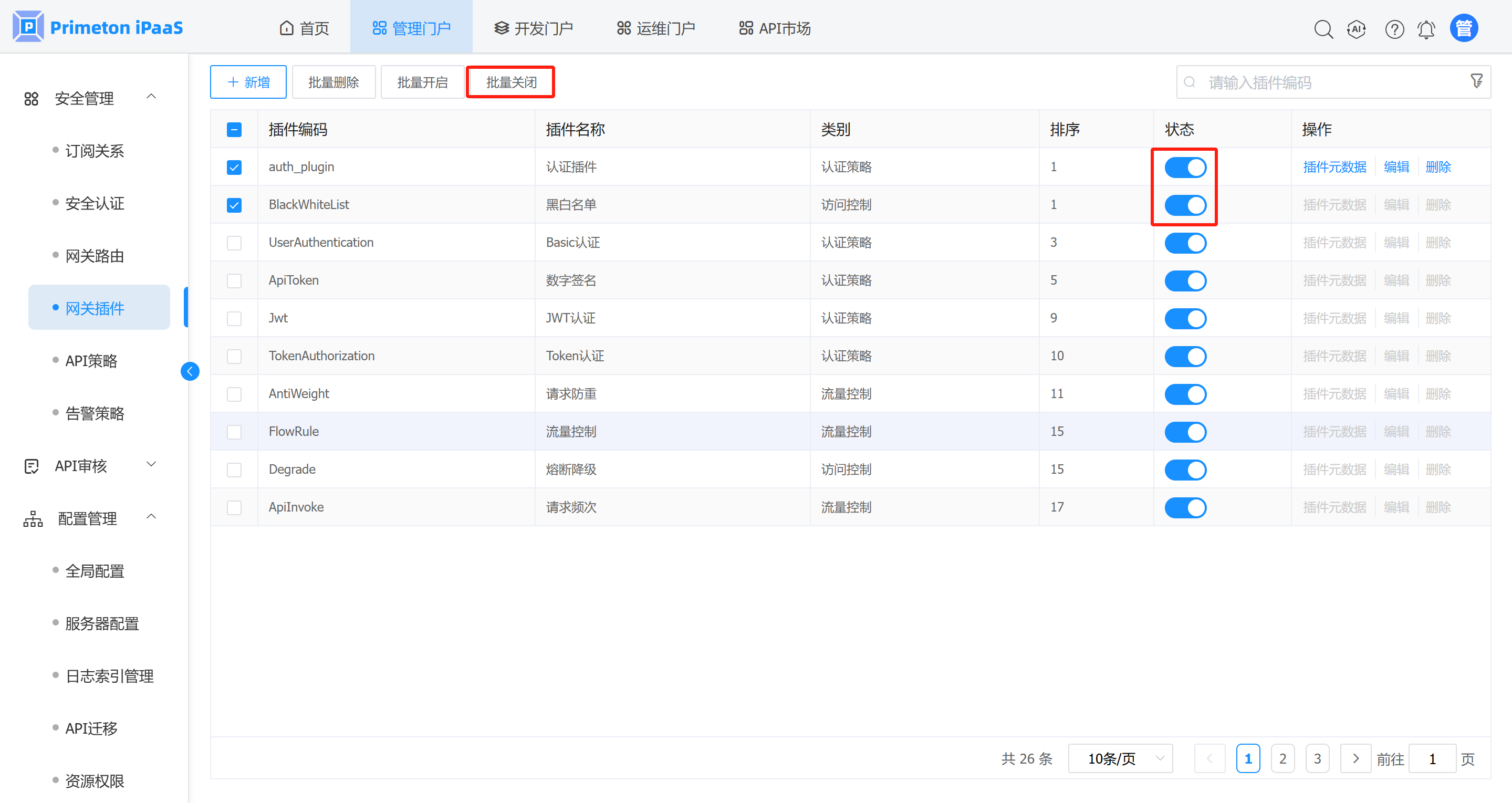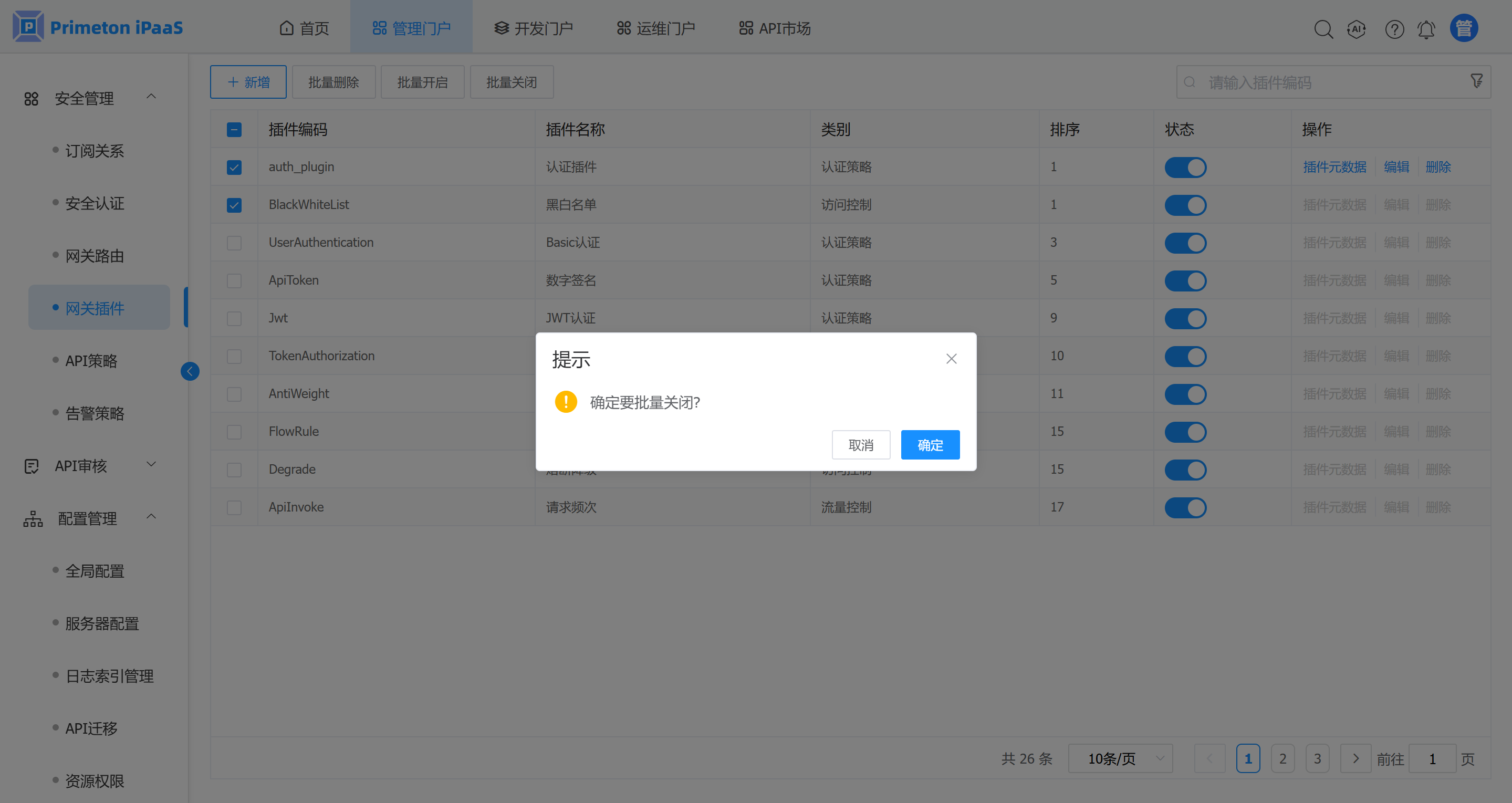 1. 在网关插件管理界面,选择需要关闭的插件,点击“批量关闭”按钮,弹出确认提示框。