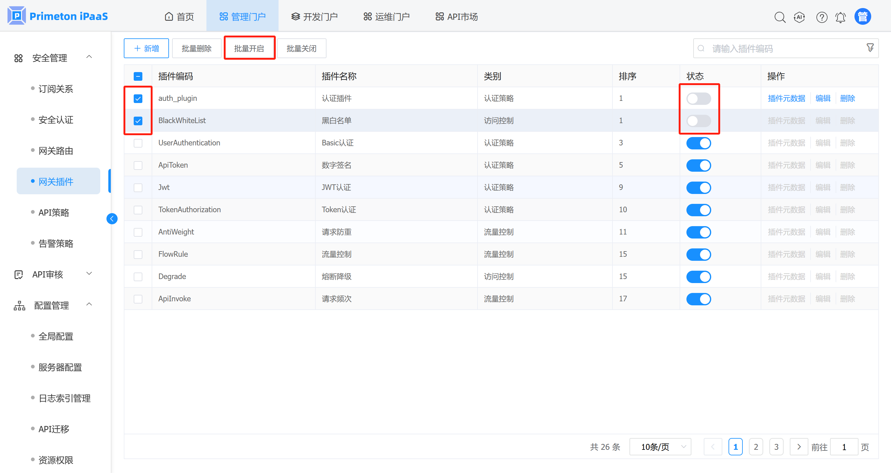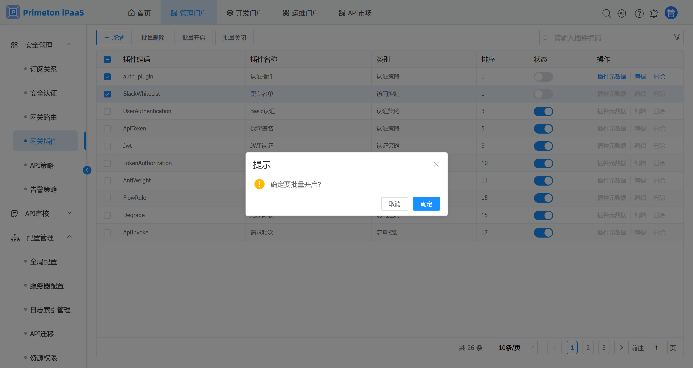 1. 在网关插件管理界面,选择需要开启的插件,点击“批量开启”按钮,弹出确认提示框。