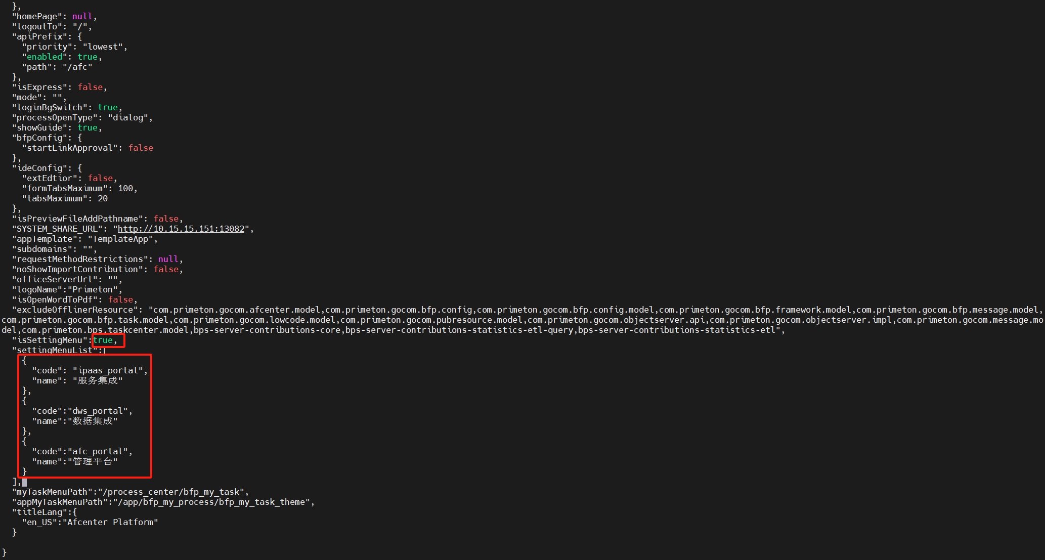 2、打开{AFCenter-UI}/config/app-config.json文件,将isSettingMenu配置改为true,在settingMenuList添加如下配置(如果app-config.json中没有isSettingMenu和settingMenuList配置,请手动添加该配置):