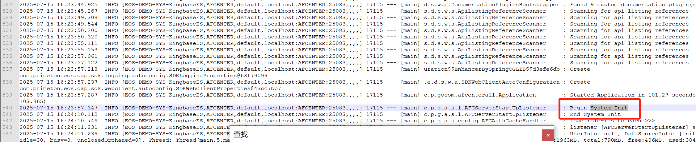 如果日志中仅看到 Begin System Init 而未出现 End System Init,或者在这两条日志之间出现异常堆栈,则说明初始化过程被中断或失败。